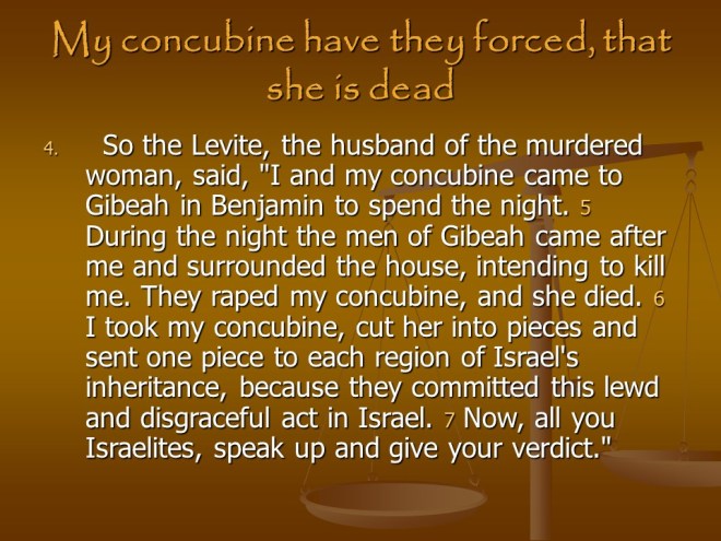 Judges 19 tells in painful detail about the Levite’s Concubine and Gibeah’s crime, probably the most gruesome story in all the Bible. The Bible is honest and tells it as it was, totally wicked.