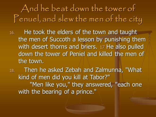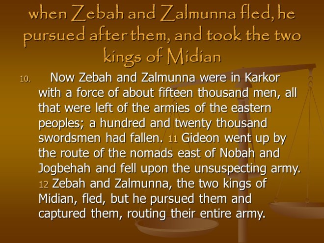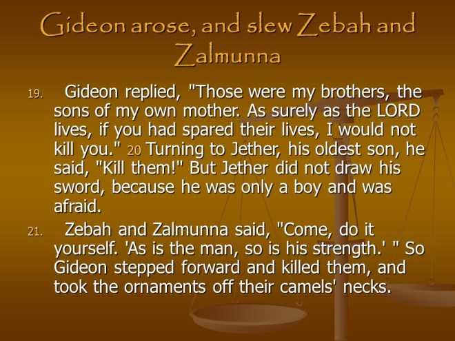 Judges 8. Gideon Defeated the Midianites, the story is getting complicated but read it anyway. After the great victory Gideon made an Ephod from the Ishmaelites’ golden earrings and this became a snare to them all. Finally Gideon died and immediately after that the Israelites fell back into idolatry, worshiping Baal.