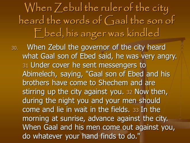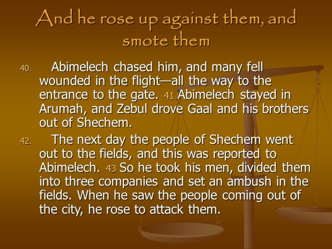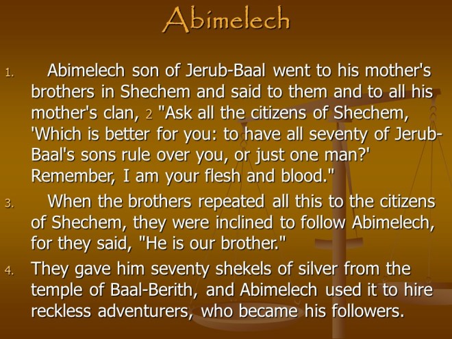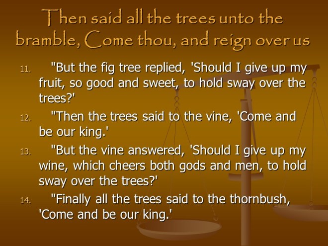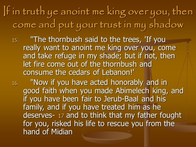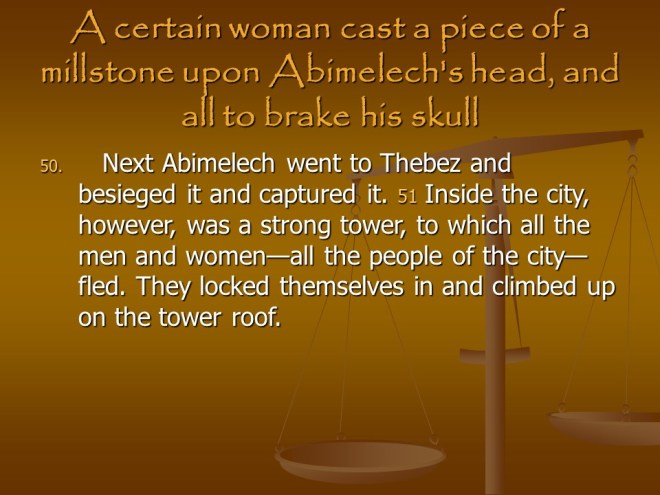 Judges 9. The Bible tells it as it is, warts and all. So it is with the story of Abimelech’s Conspiracy and the parable of the trees. All the evil led to Abimelech’s downfall. A take home from this chapter is his last words, after his skull was cracked by a millstone, dropped by a woman. “Draw thy sword, and slay me, that men say not of me, A woman slew him.