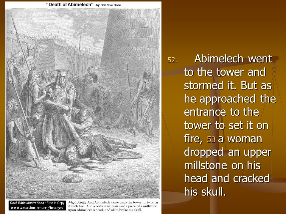 Judges 9. The Bible tells it as it is, warts and all. So it is with the story of Abimelech’s Conspiracy and the parable of the trees. All the evil led to Abimelech’s Downfall. A take home from this chapter is his last words, after his skull was cracked by a millstone, dropped by a woman. “Draw thy sword, and slay me, that men say not of me, A woman slew him.