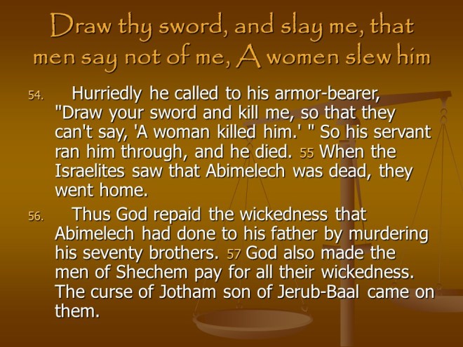 Judges 9. The Bible tells it as it is, warts and all. So is the story of Abimelech’s Conspiracy and the parable of the trees. All the evil led to Abimelech’s Downfall. A take home from this chapter is his last words, after his skull was cracked by a millstone, dropped by a woman. “Draw thy sword, and slay me, that men say not of me, A woman slew him.”