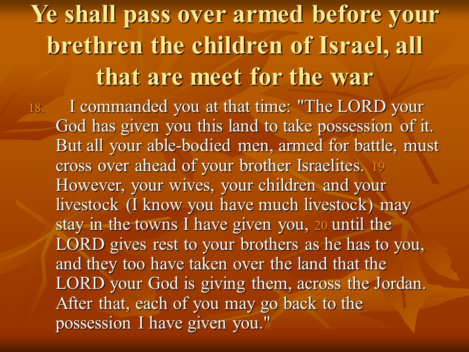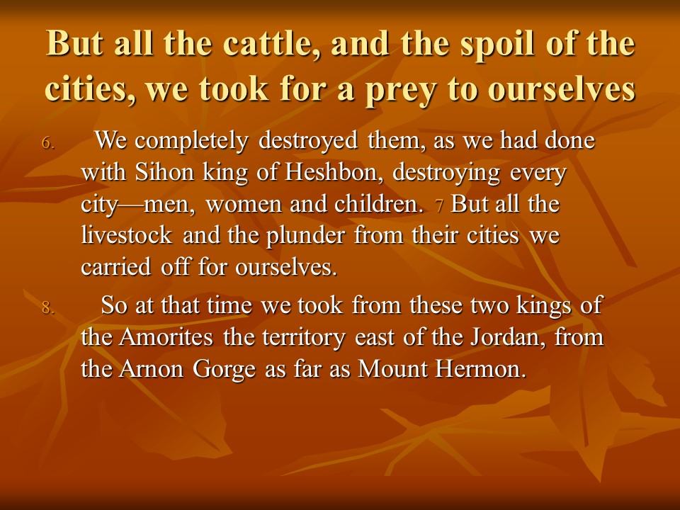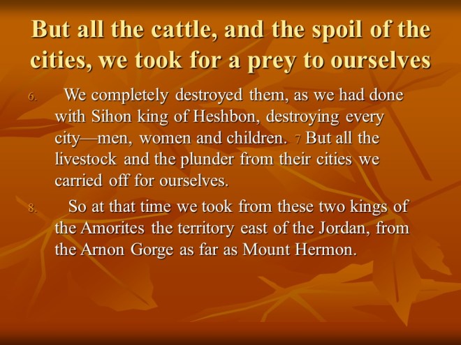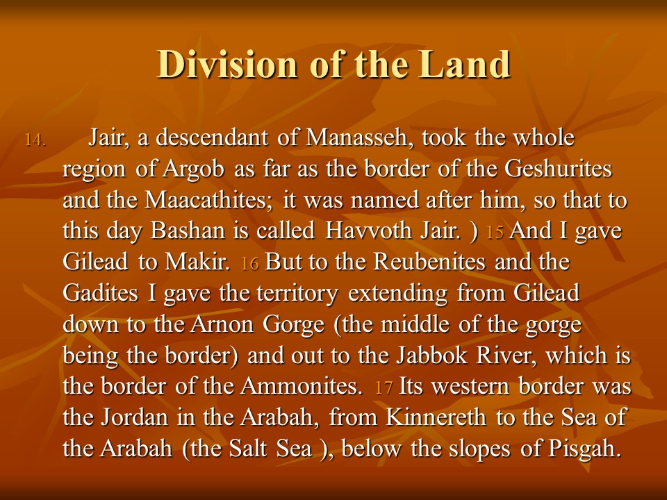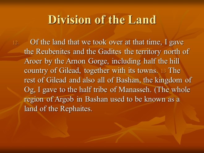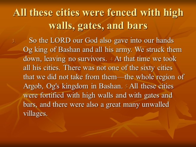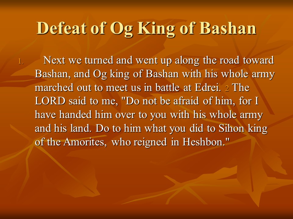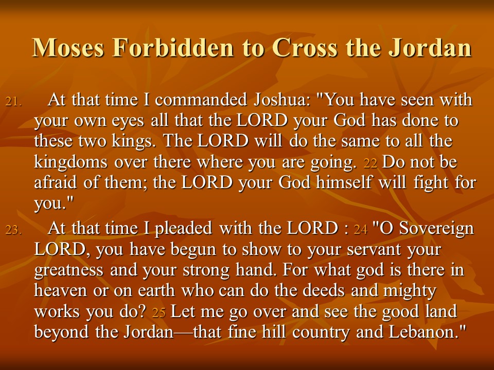 Deuteronomy 3 describes how King Og was defeated and how the Israelites conquered the land East of Jordan, but Moses was forbidden to cross the Jordan and enter the Promised Land.