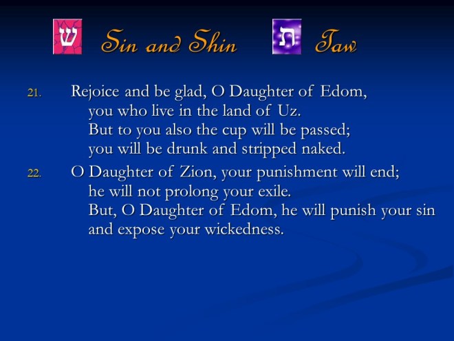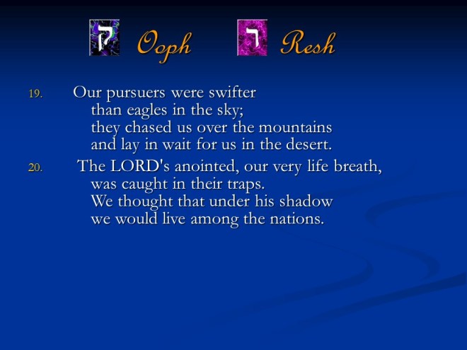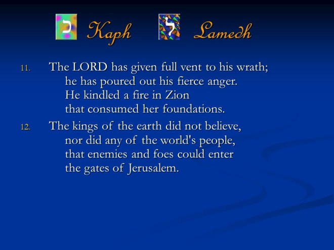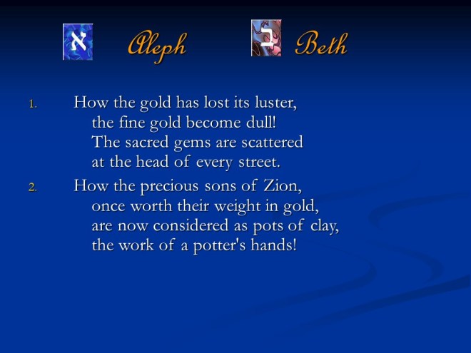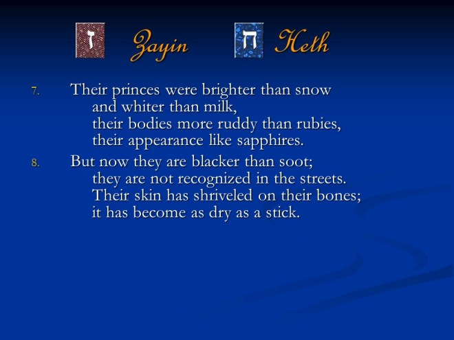 Lamentations 4. Trouble continues, the dirge continues with the degradation of Zion. And yet, there is a glimmer of hope.