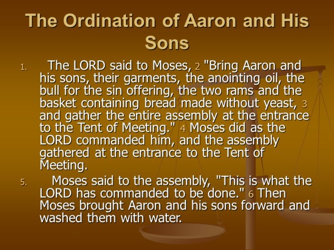 Leviticus 8 goes into some length on how the ordination of Aaron and his sons was performed.