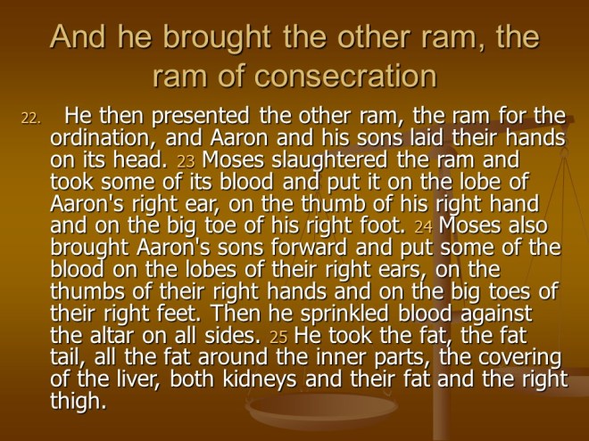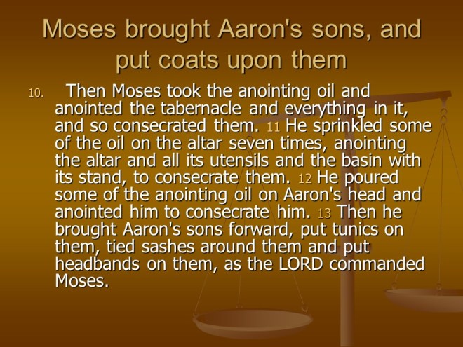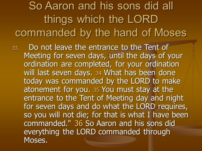 And in Leviticus 10 two of Aaron’s sons were killed by fire for violating the command of God. But Aaron’s uncle had two sons and together with two other sons of Aaron they became the new priests and the rest of the chapter deals with how they should behave.
