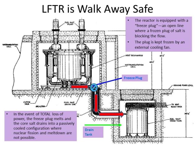With Molten Salt nuclear Reactors there is no risk for a meltdown, the fuel is already molten, and that is a safe design. The fissile fuel in a Thorium reactor is U-233 in the form of UraniumFluoride (UF4) salt which also contains Lithium and Beryllium to lower the melting point, the operating temperature is held below 650C to allow reasonably priced and available alloys that also withstand high radiation. In its molten form the salt has a very low vapor pressure. The salt flows easily through the heat exchangers and the separators. The salt is very toxic, but since it is completely sealed it is not corrosive. Being a fluid, it is constantly mixed for optimum efficiency. The reactor will never have to be shut down for refueling, it is a continuous flow process. Uranium-235 Nuclear reactors on the other hand have to be shut down for refueling and rebalancing of the fuel rods a little more often than once every two years. The average shutdown is 35 days, or about 5% of the time. Then comes the major problem of safely and securely transporting and reprocessing the spent fuel. This problem is not yet solved for conventional Nuclear power plants, so spent fuel is stored on site, sometimes for years. In a LFTR the fuel is spent as it is produced, so the fissile inventory is constantly kept at a minimum, and fission products and extra generated U-233 is separated out. this is a much cleaner process than reprocessing spent fuel. The high operating temperature gives the LFTR a much more efficient carnot cycle conversion factor of more than 40%, whereas conventional nuclear plants with water as a coolant medium cannot exceed 38% efficiency.