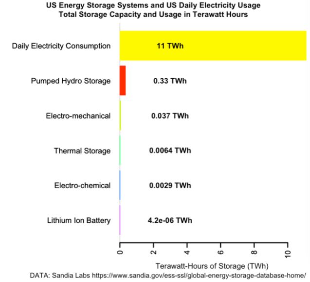 The lithium batteries we have all over, powering cellphones PCs an all kinds of electric equipment would be able to power the U.s power grid for three hundredths of a second. Large scale electro-chemical storage used by power stations, hospitals and other facilities that need uninterrupted services, also lithium-ion based, can power up the net for almost 23 seconds. And all pumped hydro-electric storage can power the grid for nearly five minutes. This means that nearly all extra peak power up to now has to be provided by Coal and natural gas electric power, since Uranium based nuclear power works as a base load.