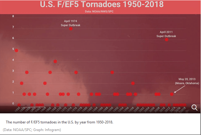 Historically, strong tornadoes are declining.