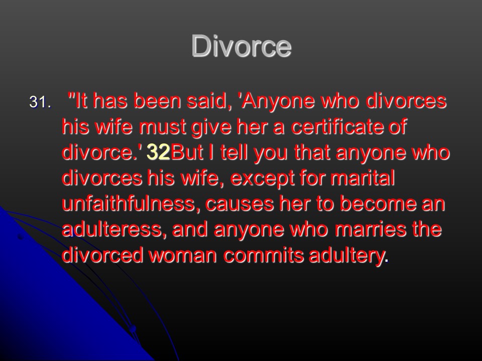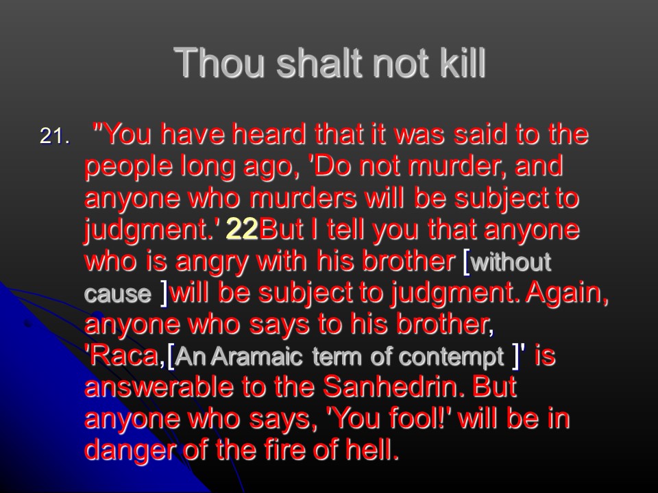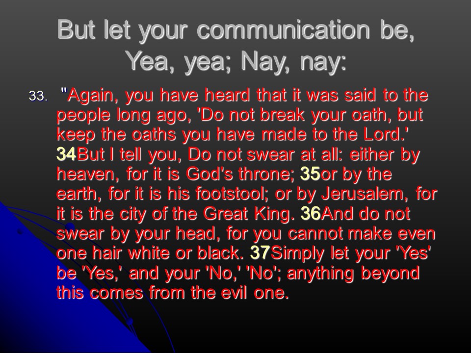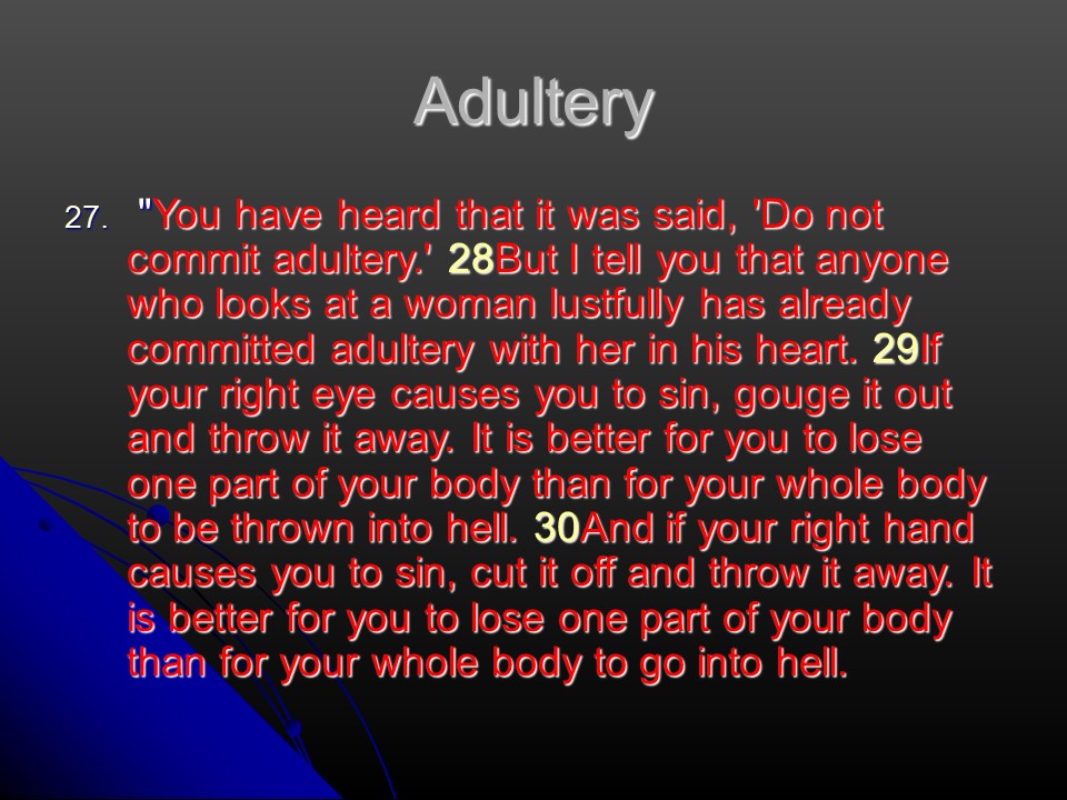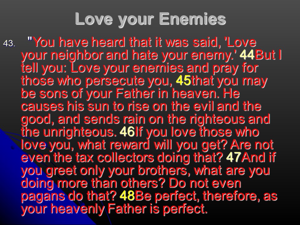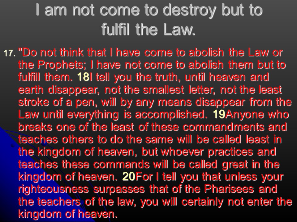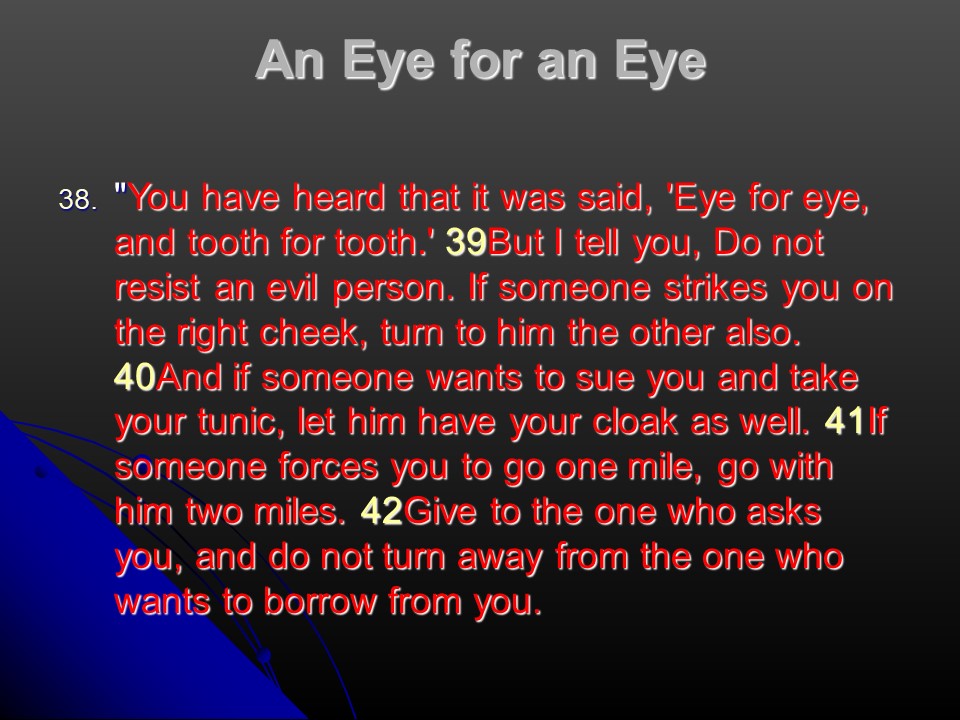 Matthew 5:21-48 is a continuation of the sermon on the mount. Jesus first addressed murder, where vengeance is not for us to do, instead you must be reconciled with your adversary before you can be reconciled to God. Then He dealt with adultery, you are not only not to do it, you are not allowed to even think about it. Likewise, the only time divorce is allowed is for already committed adultery. Piling on, he addressed taking of oaths, this was serious business under the Law, but Jesus said “Let your yes be yes and your no, no”. Furthermore it was said “An eye for an eye” But Jesus told us to pray for our adversaries, no matter what, and to love your enemies. This is the change between Old and New Testament Theology, and Jesus brought it fourth.