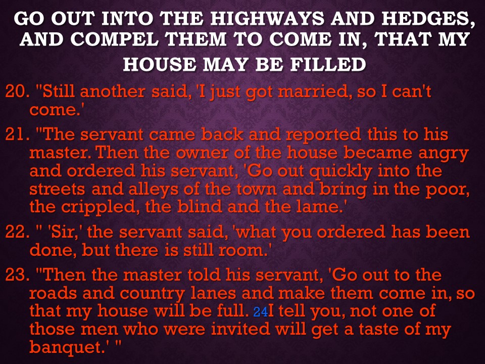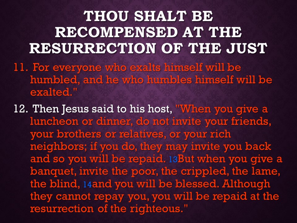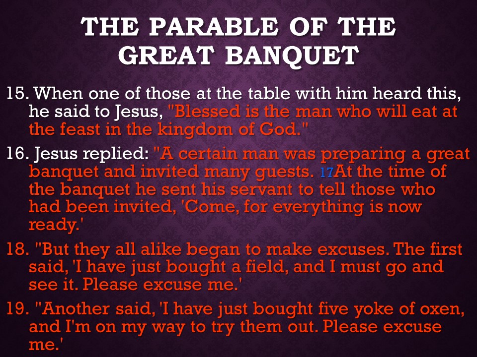 In Luke 14, , again on the Sabbath, at a Pharisee’s house no less, Jesus healed a man with dropsy. Noticing how the people competed for the best places Jesus spoke of the lowly place to be sought rather than the place of honor, and as an object lesson he gave us the parable of the Great Supper and the cost of following Christ. Finally Jesus mentioned the value of good salt and the worthlessness of salt that lost its savor.