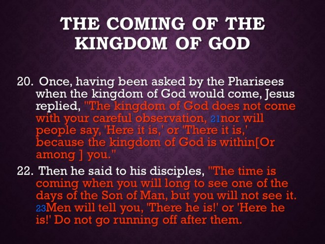 Luke 17. Jesus begins with telling of the consequences of sin, the importance of faith and the call of duty. Then comes the story of ten lepers healed but only one came back and thanked Jesus, and he was a Samaritan! Finally Jesus tells of the Coming of the Kingdom of God and the end times.