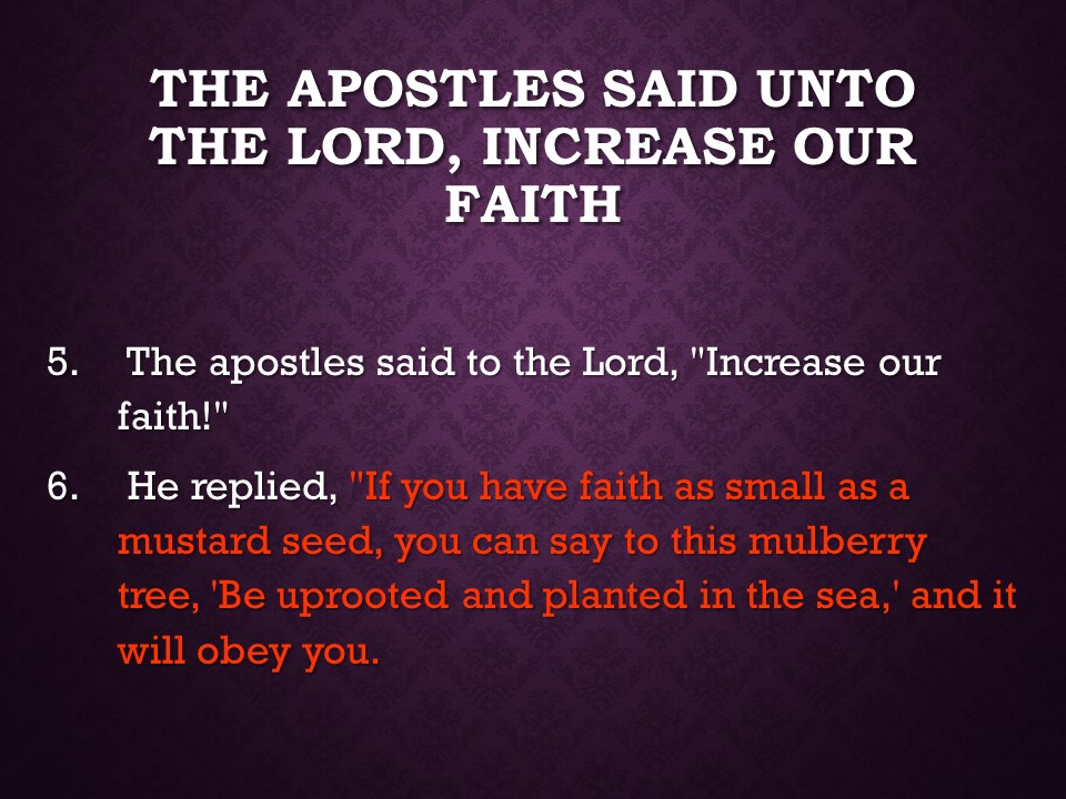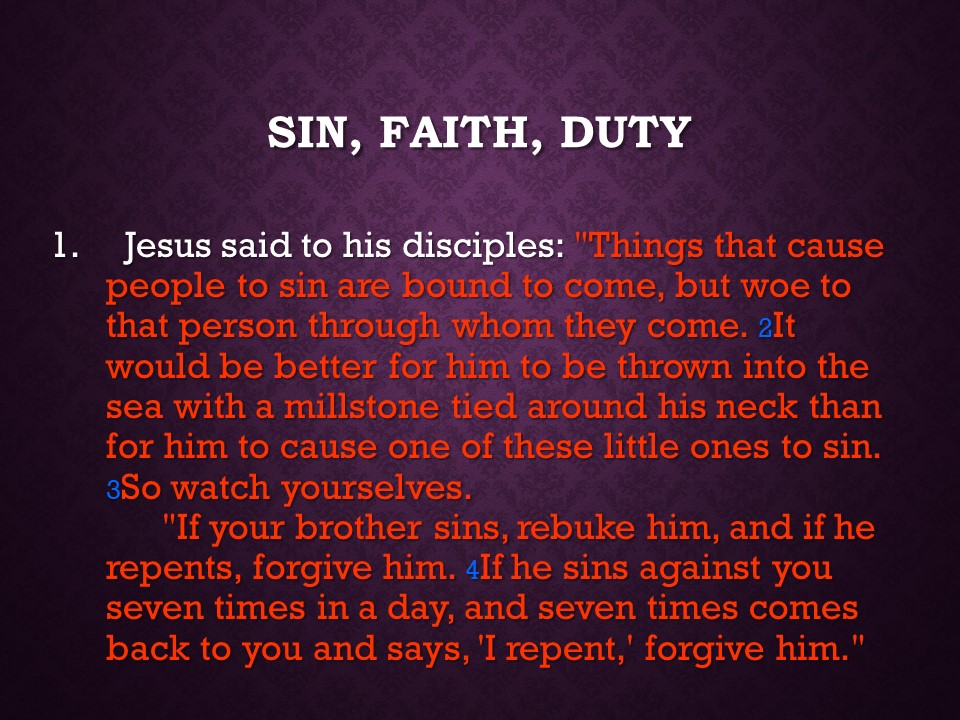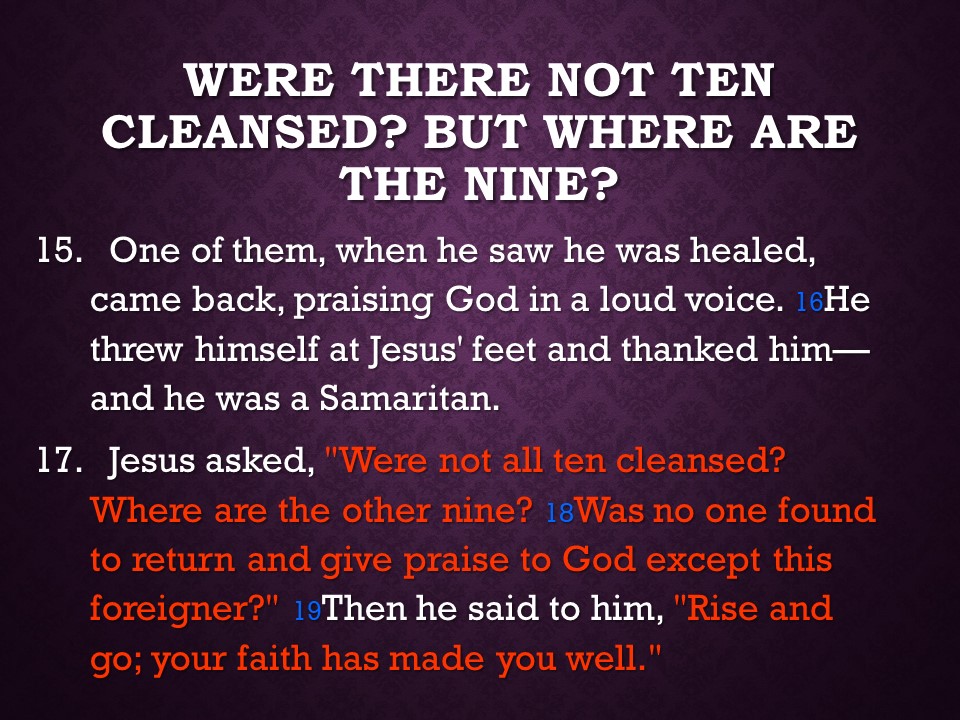 Luke 17. Jesus told of the consequences of sin, the importance of faith and the call of duty. Then is recorded the story of ten lepers healed but only one came back and thanked Jesus, and he was a Samaritan! Finally Jesus spoke of the Coming of the Kingdom of God and the end times.