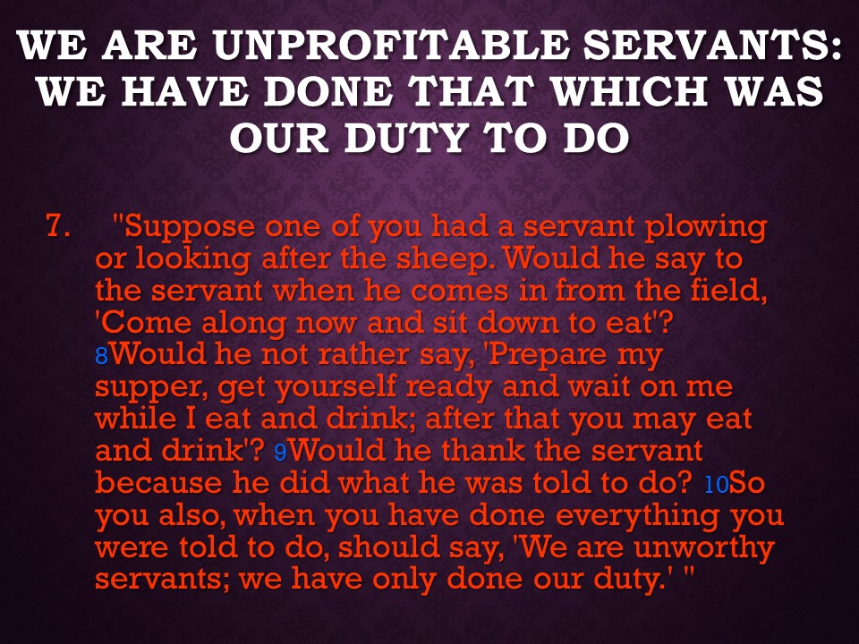 Luke 17. Jesus begins with telling of the consequences of sin, the importance of faith and the call of duty. Then comes the story of ten lepers healed but only one came back and thanked Jesus, and he was a Samaritan! Finally Jesus tells of the Coming of the Kingdom of God and the end times.