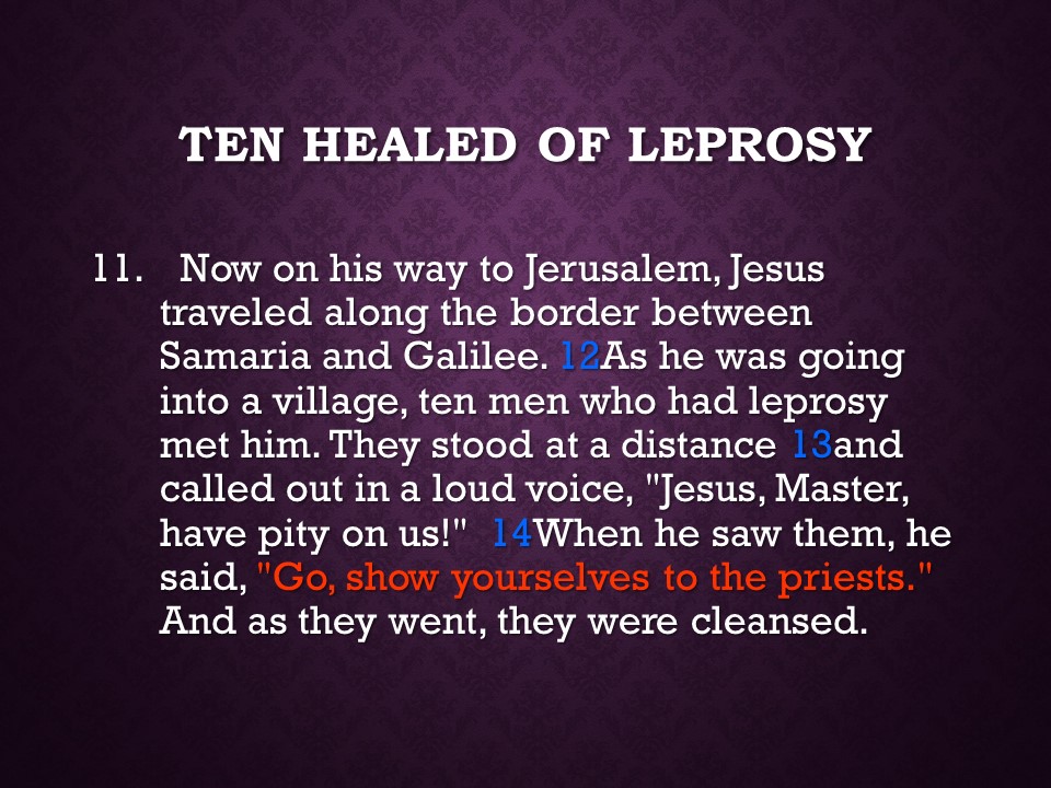 Luke 17. Jesus told about the consequences of sin, the importance of faith and the call of duty. Then is recorded the story of ten lepers healed but only one came back and thanked Jesus, and he was a Samaritan! Finally Jesus spoke of the Coming of the Kingdom of God and the end times.