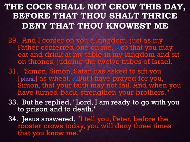 Luke 22. Judas agreed to betray Jesus, it was Passover so Jesus commemorated the Last Supper with his disciples, after which they went to the garden of Gethsemane where Jesus prayed. While they were there Jesus was betrayed, arrested and taken to the house of the high priest. Waiting outside, Peter disowns Jesus three times before the cock crowd. Jesus was interrogated during the night and before daybreak the Sanhedrin had heard enough, and were ready to sentence him to death, but only the Romans had the right to execute the sentence.