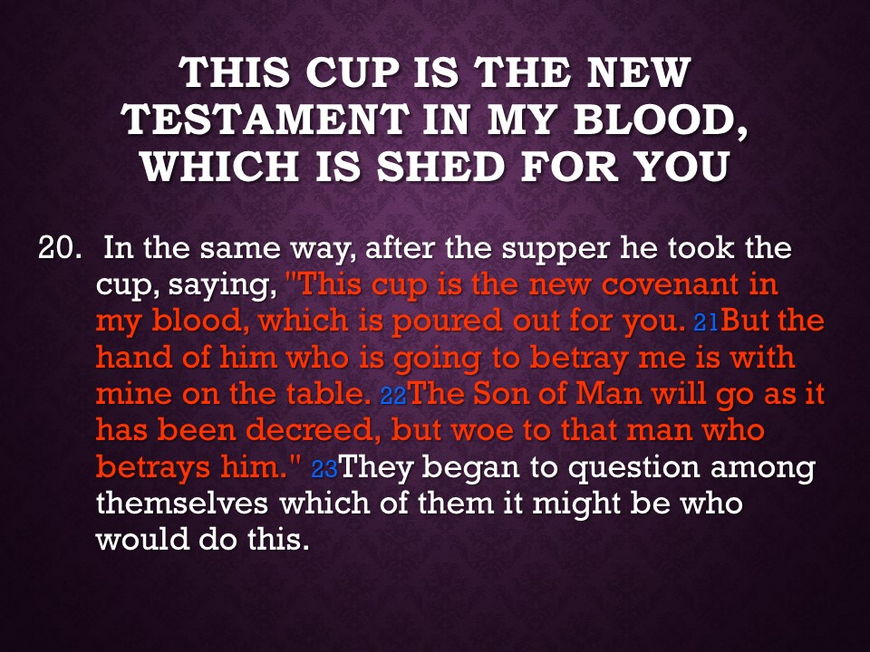 Luke 22. Judas agreed to betray Jesus, it was Passover so Jesus commemorated the Last Supper with his disciples, after which they went to the garden of Gethsemane where Jesus prayed. While they were there Jesus was betrayed, arrested and taken to the house of the high priest. Waiting outside, Peter disowns Jesus three times before the cock crowd. Jesus was interrogated during the night and before daybreak the Sanhedrin had heard enough, and were ready to sentence him to death, but only the Romans had the right to execute the sentence.