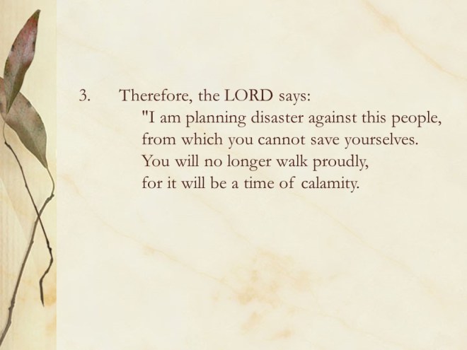 Micah 1. The prophet told of the coming judgment on Israel with mourning for Israel and Judah.