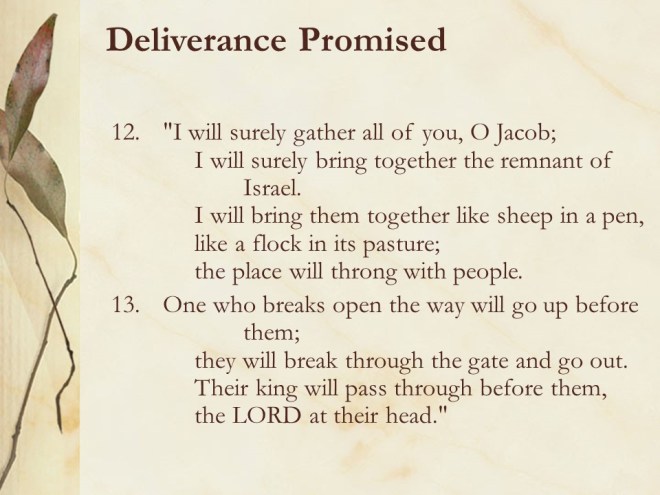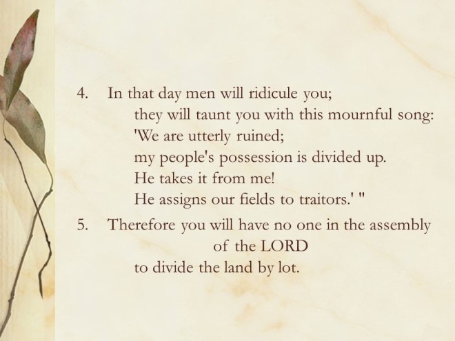 Micah 2. The prophet proclaimed woe to evildoers and lying prophets. After that Israel will be restored.