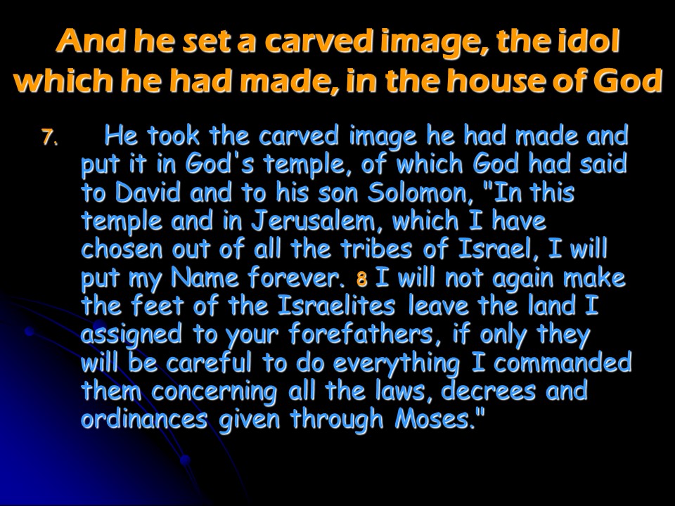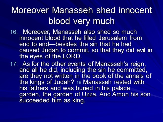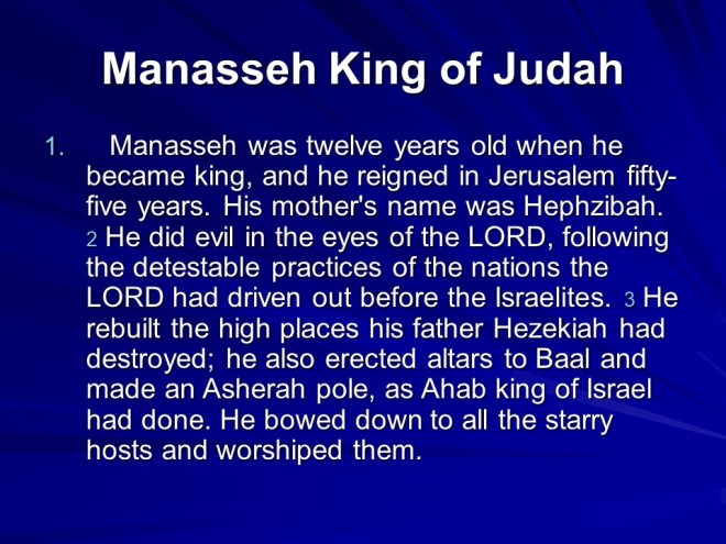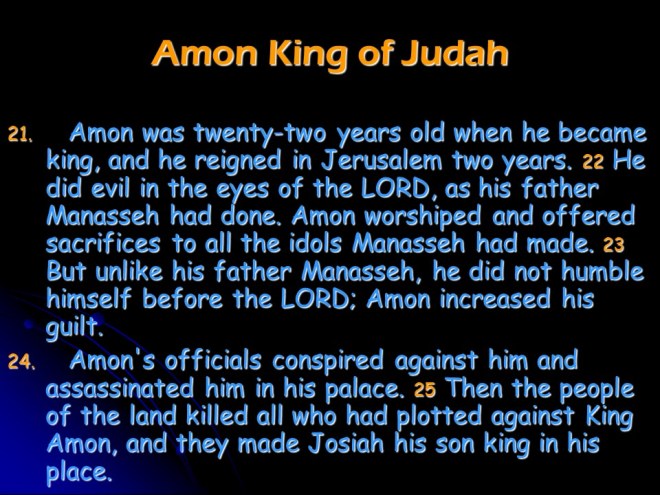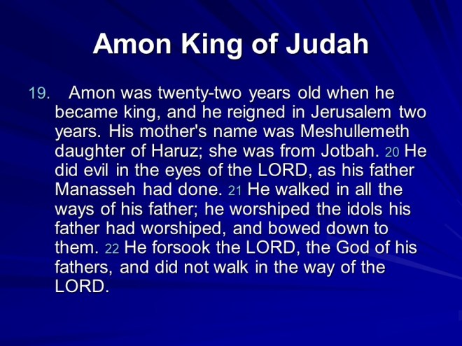 Chronicles 33. Manasseh, king of Judah became a sorcerer, repented and was restored but eventually died and was replaced by Amon , who reigned for two years, did evil, was killed and his son Josiah became king