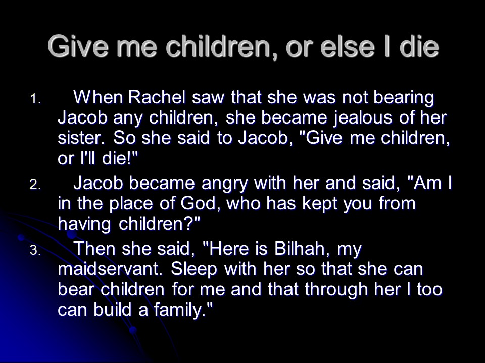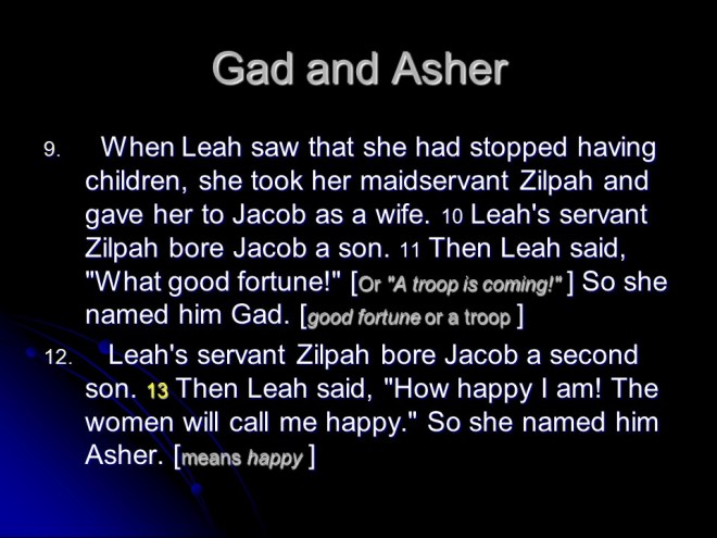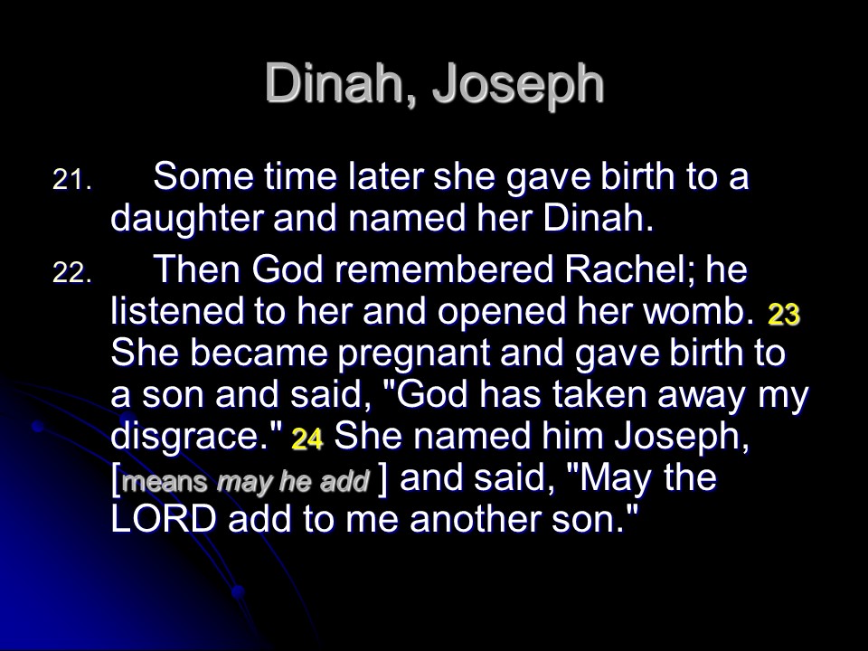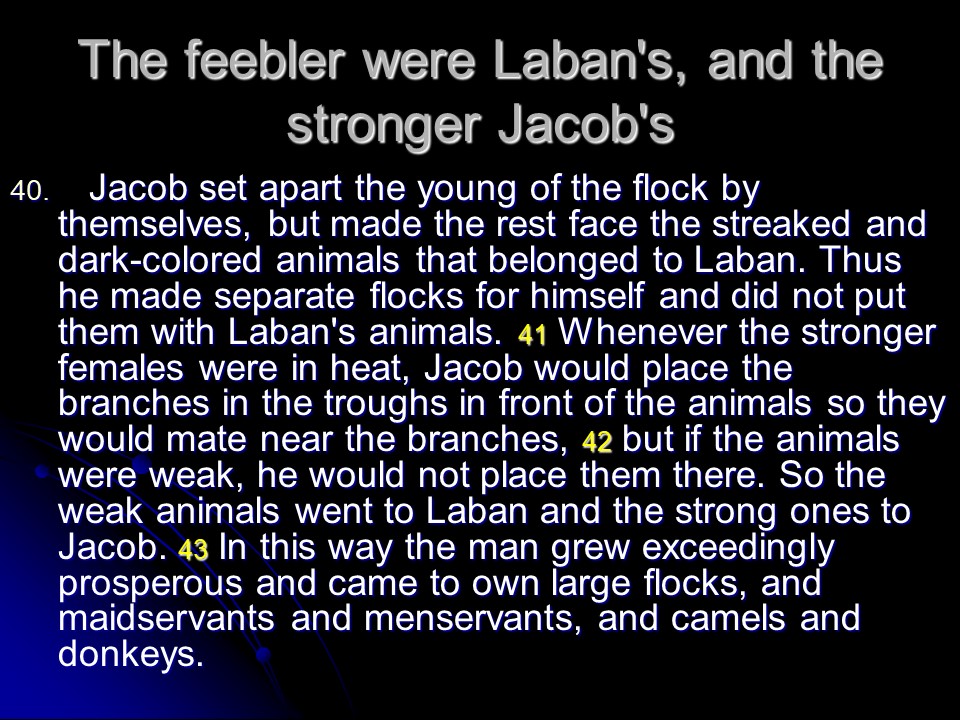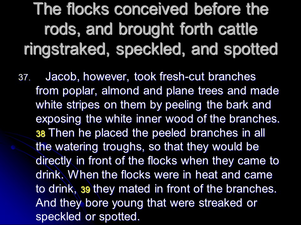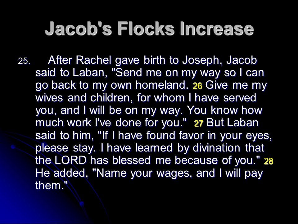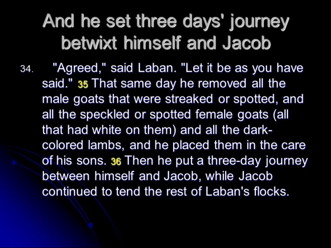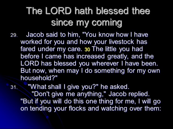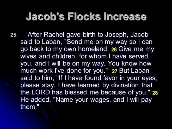 Genesis 30 records the remaining children born to Jacob (except Benjamin, who would be born later). It also tells a story about Rachel, desperate to get a child of her own was bargaining with Leah for Reuben’s mandrakes. After Joseph was born, Jacob wanted to leave and go back to the promised land, but Laban bargained with him to stay and make them even more prosperous. Through selective breeding Jacob acquired the majority of the flocks and became wealthy.