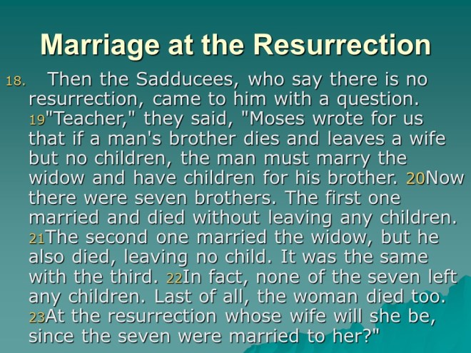 Mark 12:1-27 begins with Jesus telling the parable of the unfaithful tenants, and after that the Pharisees tried to entrap Jesus with the question “Is it right to pay taxes to Caesar?” You know the answer, if not, check it and ponder. Then it was the Sadducees’ turn to entrap him with the question what happens to marriage at the Resurrection. Jesus answered: “He is not the God of the dead, but the God of the living: ye therefore do greatly err.”