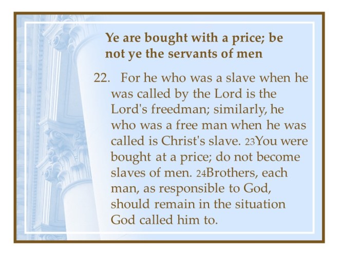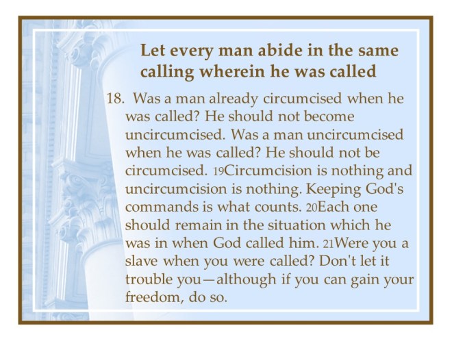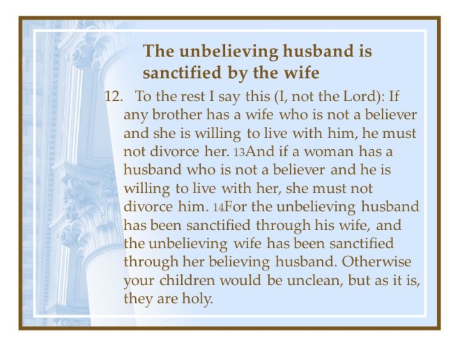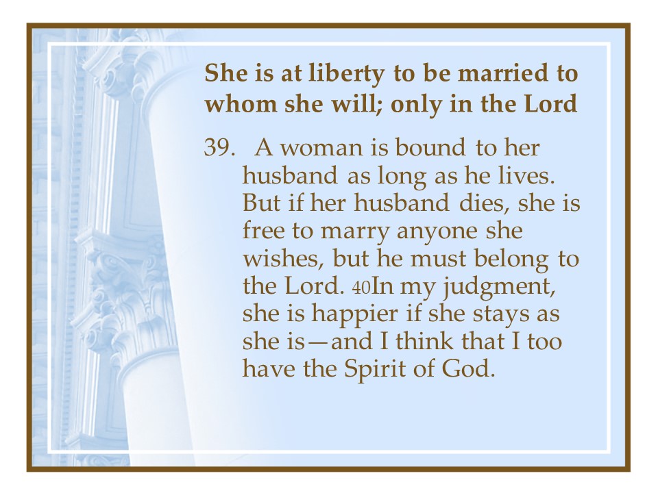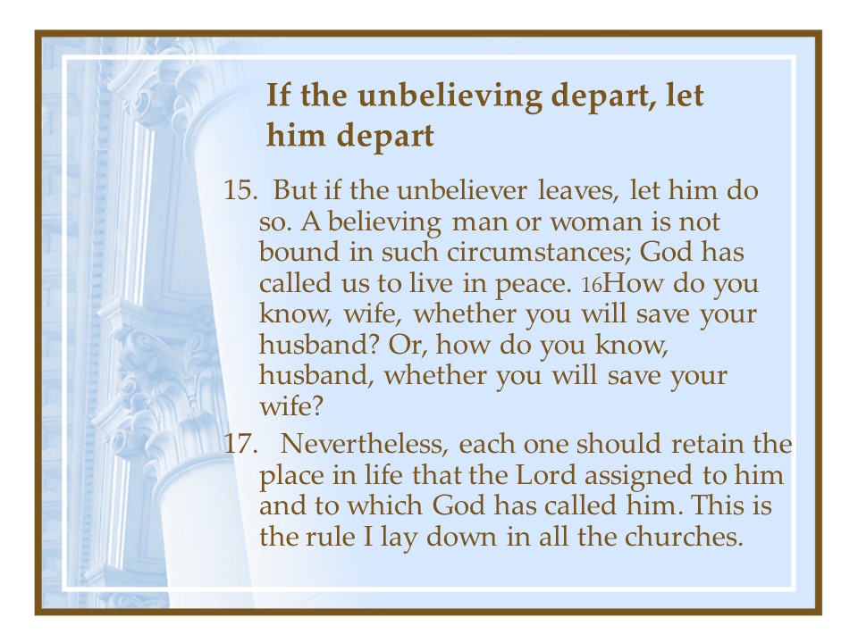 1 Corinthians 7. In this chapter the Apostle Paul dealt with marriage principles; it is good to remain celibate, but for most of us, keep your marriage vows, live as you are called. Divorce is always wrong, but if you do, continue unmarried. If separation is by death you are free to marry, as long as it is another believer.