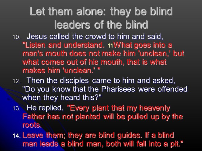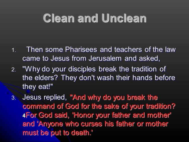 In Matthew 15 Jesus defined what defiles a person; it is not what he eats, but what comes out of his mouth. Ceremonial cleansing is just for show. Jesus then went to Canaanite territory, the region of Tyre and Sidon where he met a Canaanite woman with a sick daughter. She had such great a faith that Jesus healed her daughter from afar. Jesus went back to the sea of Galilee and did many other miracles. Large crowds followed him, and after having been without food for three days he fed the crowd of 4000 (plus women and children). This time they had seven loaves of bread and a few fishes. After eating to everybody’s satisfaction the disciples picked up seven baskets of leftovers. (No waste here).