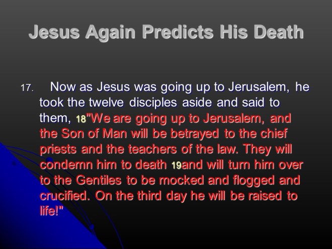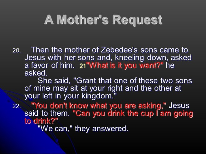In Matthew 20 Jesus told the parable of the workers in the vineyard, that God is always fair even when we don’t think so. Then he predicted his death. After that the mother of Zebedee’s sons asked Jesus to have her sons be the seated with Jesus in the kingdom of heaven, but Jesus answer was that is only for the Father to decide. The other disciples got angry, but Jesus admonished them all that the kingdom of heaven means to be a servant. The chapter ends with Jesus, out of compassion healed two blind men.