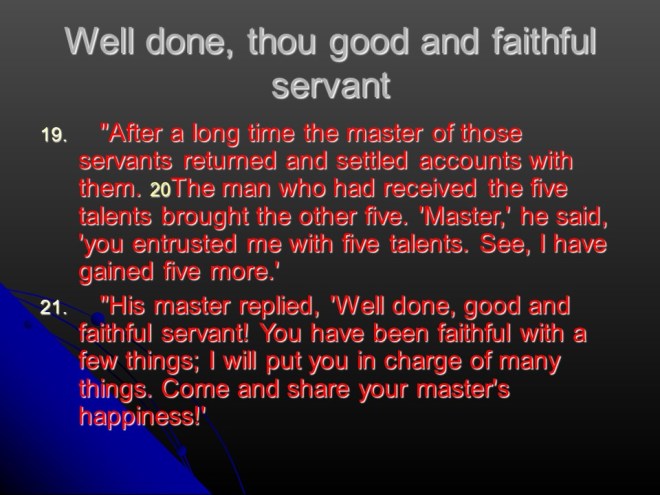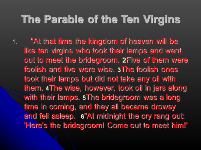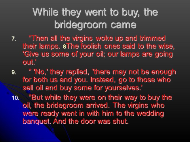 Matthew 25:1-30 begins with the parable of the ten virgins, five with oil, five without oil. (Give me oil in my lamp, keep it burning). After that Jesus told the parable of the five, two and one talent given to three different people, the one with five made ten, the one with two doubled his talents, but the one with only one talent buried his. Jesus had his one talent taken away and be given to the one with ten talents. The moral of this parable is: Equal opportunity, not equal outcome.