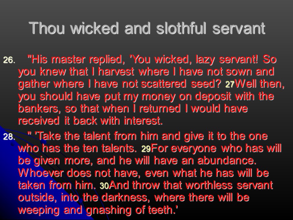 Matthew 25:1-30 begins with the parable of the ten virgins, five with oil, five without oil. (Give me oil in my lamp, keep it burning). After that Jesus told the parable of the five, two and one talent given to three different people, the one with five made ten, the one with two doubled his talents, but the one with only one talent buried his. Jesus had his one talent taken away and be given to the one with ten talents. The moral of this parable is: Equal opportunity, not equal outcome.