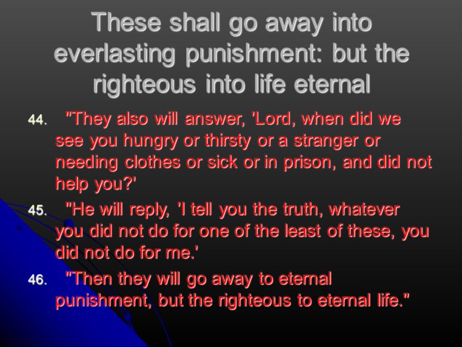 Matthew 25: 31-46. Jesus will return to judge the nations, to illustrate how he told the parable of the sheep and the goats, and the sheep were defined as those who do God’s will “You did it for me.”