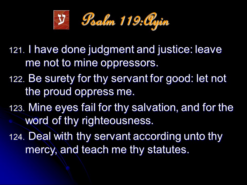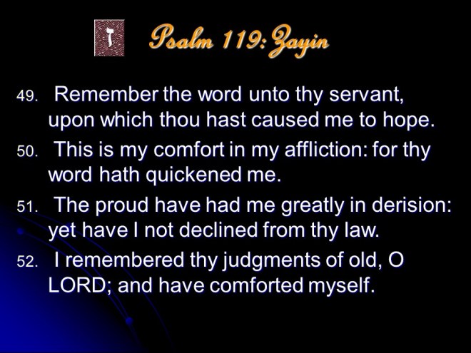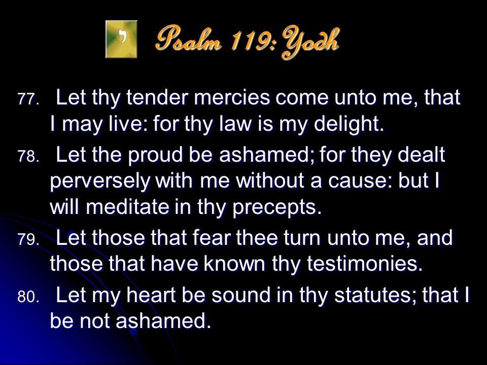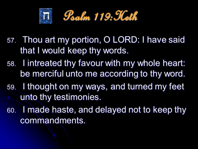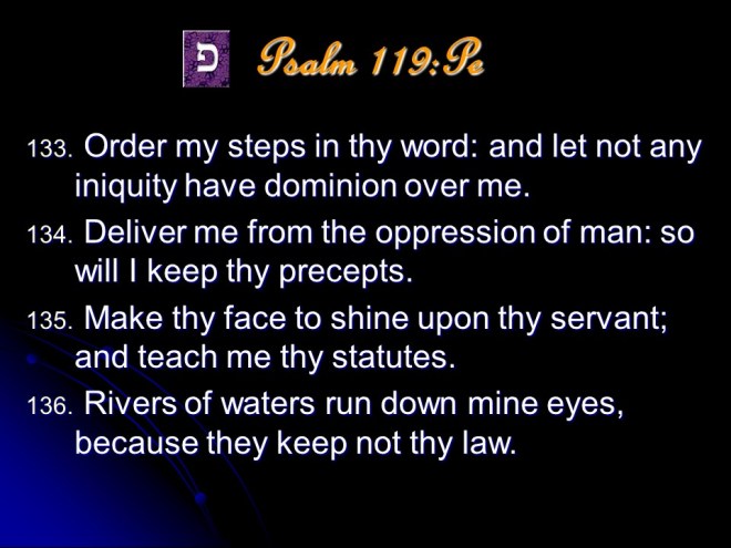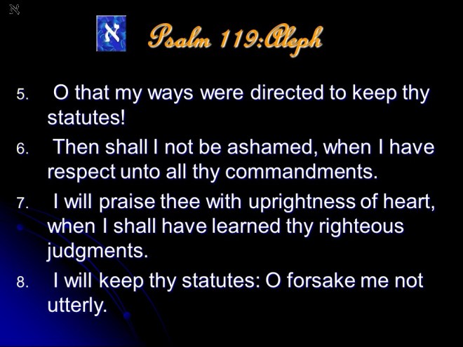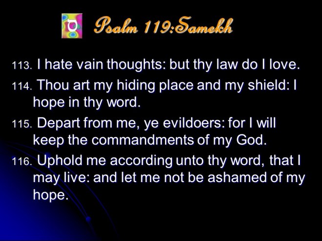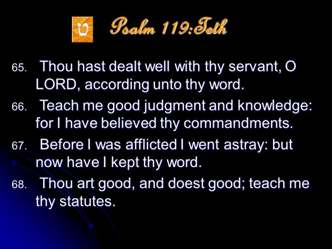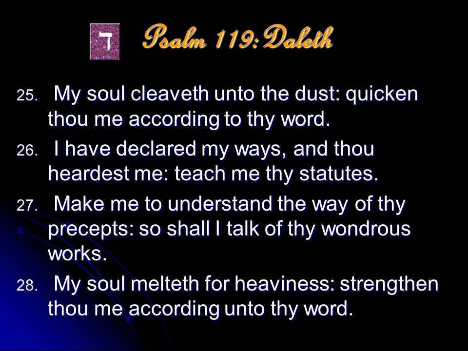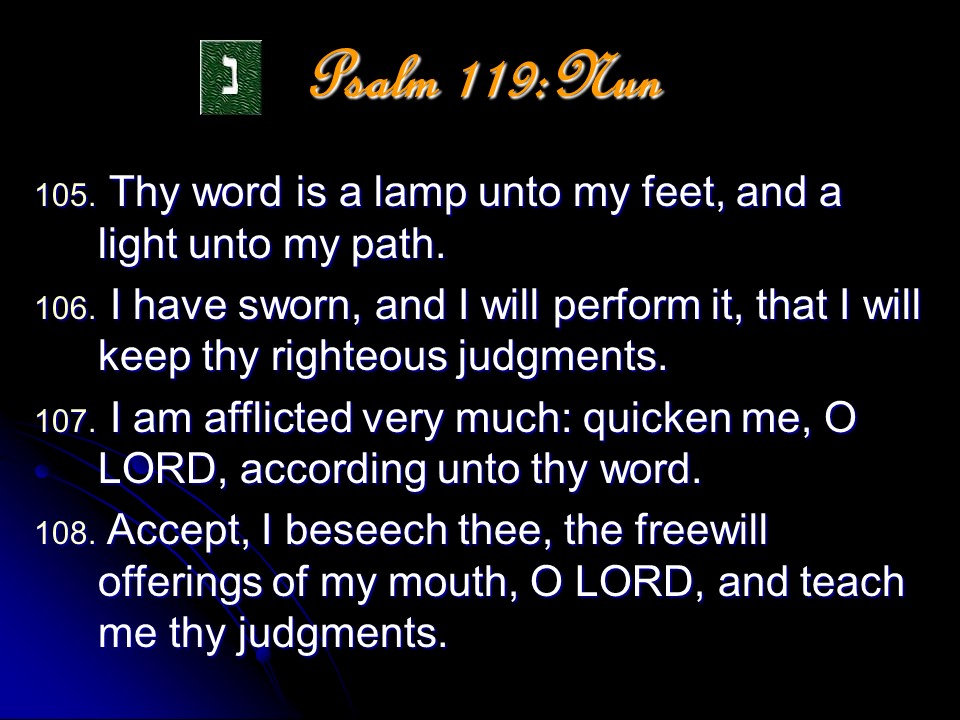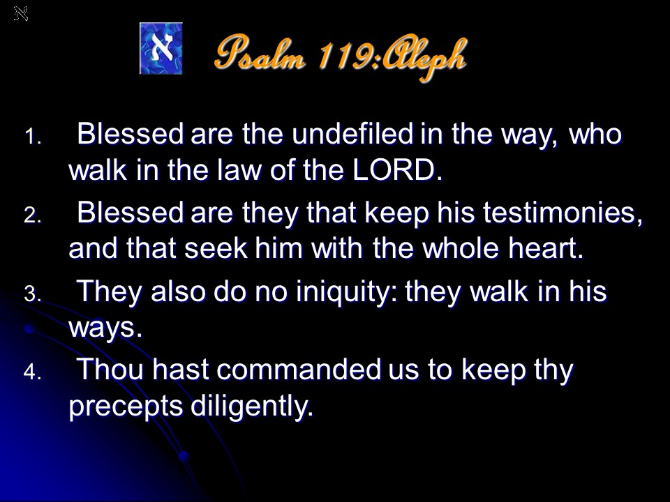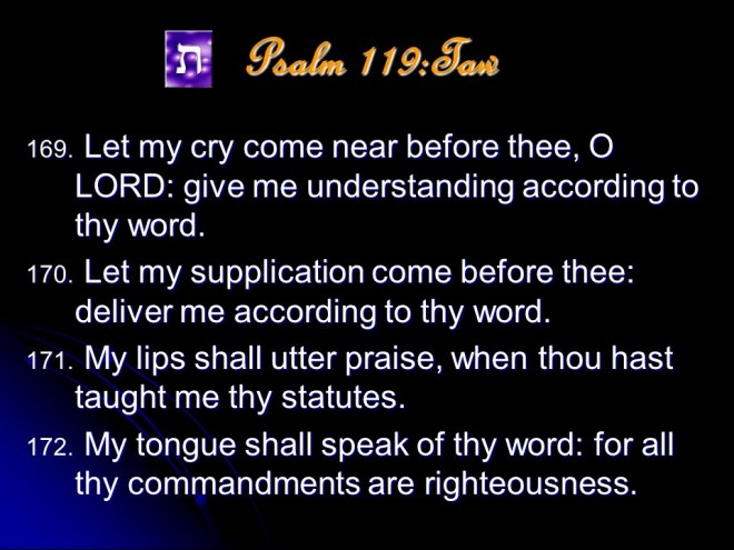 Psalm 119 is a meditation on the excellence of the Word of God. It it anonymous, but is most probably a collection made by David and put in its final form during the time of Ezra. The Psalm is in the form of a true acrostic with eight verses for every letter of the Hebrew alphabet, totaling 176 verses. The acrostic form makes it possible to memorize, and this the students learning the Law did; even during Jesus’ time.