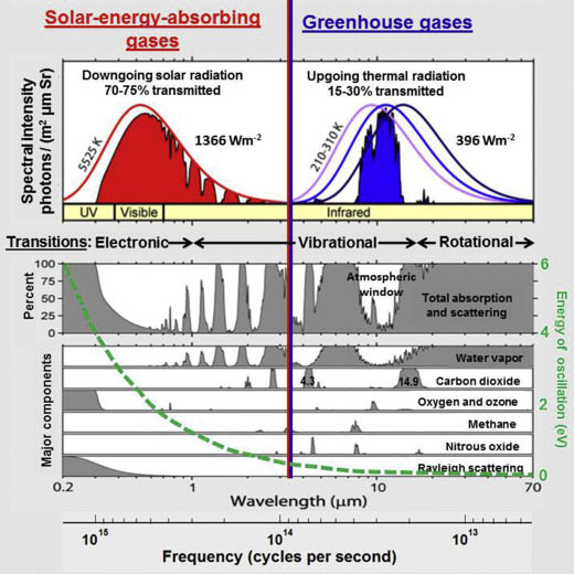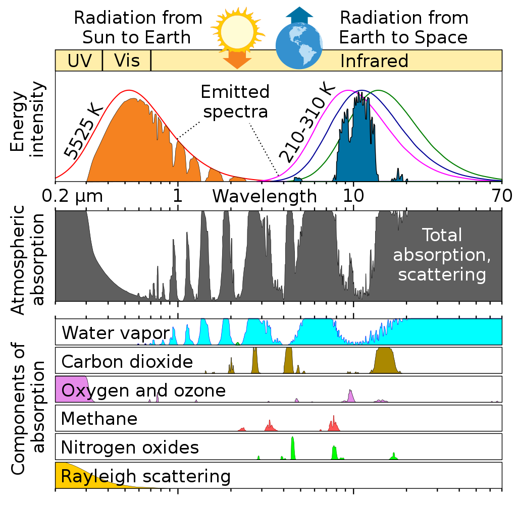 For this we will have to look at the frequency ranges of the incoming solar radiation and the outgoing black body radiation of the earth. It is the latter that causes the greenhouse effect. Take a look at this chart: