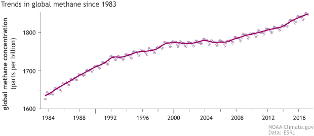 In 1980 the CH4 concentration was 1.6 ppm and will be 2.0 ppm in 2022 which results in an increase of the greenhouse effect of 0.035 C or 0.17 W/m2 ERF from rising levels of Methane since 1980.