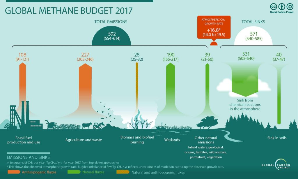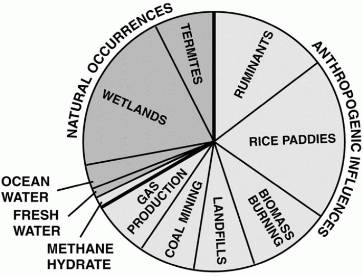 Methane gas is created from a variety of sources, both man made and natural. See pie chart