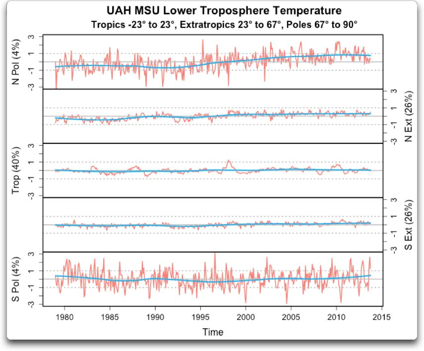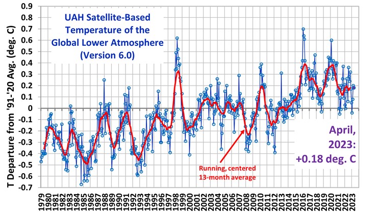 This will change the relative importance of greenhouse gasses drastically so it must be tested against reality. We now have a good global satellite temperature record from 1980 to 2022 or 43 years: