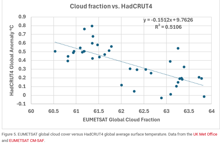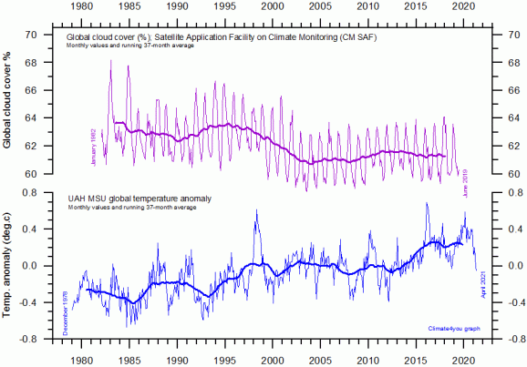 Between 1980 and 2022 the net humidity increase is 3.6% minus 0.75% relative humidity for a net increase of 3.54%. This increase only matters in the atmospheric window which is on average 25% saturated, so the total increase from water vapor increase is 0.26 * 2.375 * 0.25 * 0.9925 = 0.15 W/m2 or 0.03 C., to be added to the total before increase in humidity.This means that for a 0.5C temperature increase between 1980 and 2022 the total sensitivity to water vapor is 1.75 W/m2 or 0.37 C. A confirming picture of the total cloud cover shows the , but temperature sensitivity to the decline in cloud cover between 1980 and 2015