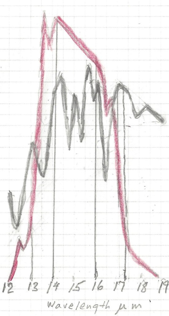 Let us now take a look at the Carbon Dioxide bands of absorption, at 2.7, 4.3 and 15 μm. Of them the 2.7 and 4.3 μm bands absorb where there is little black body radiation, the only band that counts is at 14.9 μm, and that is in a band where the black body radiation is near its maximum. Let us first consider the CO2 alone in a dry atmosphere, that is one with no water vapor at all. We will investigate the concentration of 335 ppm (in 1980) and 415 ppm (in 2022)