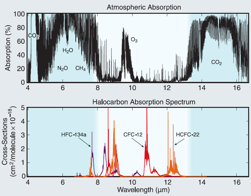 CFC started to be phased out and replaced by HydroFluoroCarbons (HFC), less efficient and more expensive, but at least they do not deplete the Ozone layer that protects us from cancer. Some of the HFCs are even bigger greenhouse effect generators than CFC, but well worth it to protect the Ozone layer. Their biggest absorption bands are in the middle of the atmospheric window.