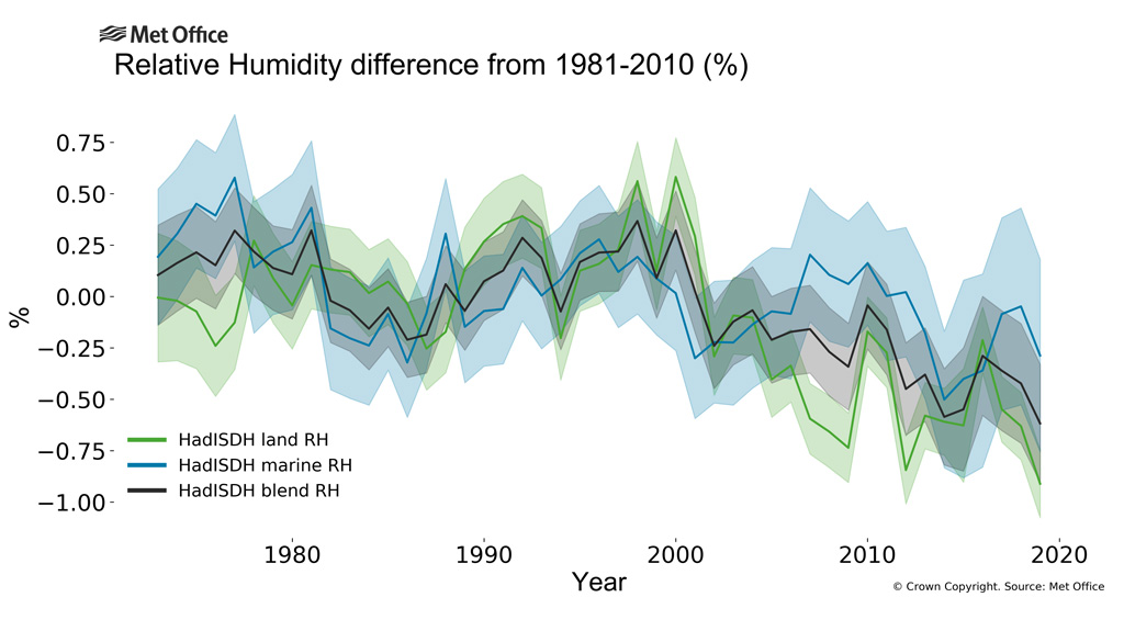 When average temperature rises 0.5 C, the possible absorption rises by 2.375 W/m2 minus the energy that escapes through the atmospheric window.Water vapor through saturation: is responsible for all of this increase except where other gasses also absorb in the atmospheric window, and in the atmospheric window the absorption must be proportionally shared, subject to the 100% absorption limitation.The atmospheric window is about 26% of all the emitted radiation so net water absorption is 0.74 * 2.375 = 1.6 W.m2 or 0.34 C. However, the relative humidity is also decreasing, see picture: