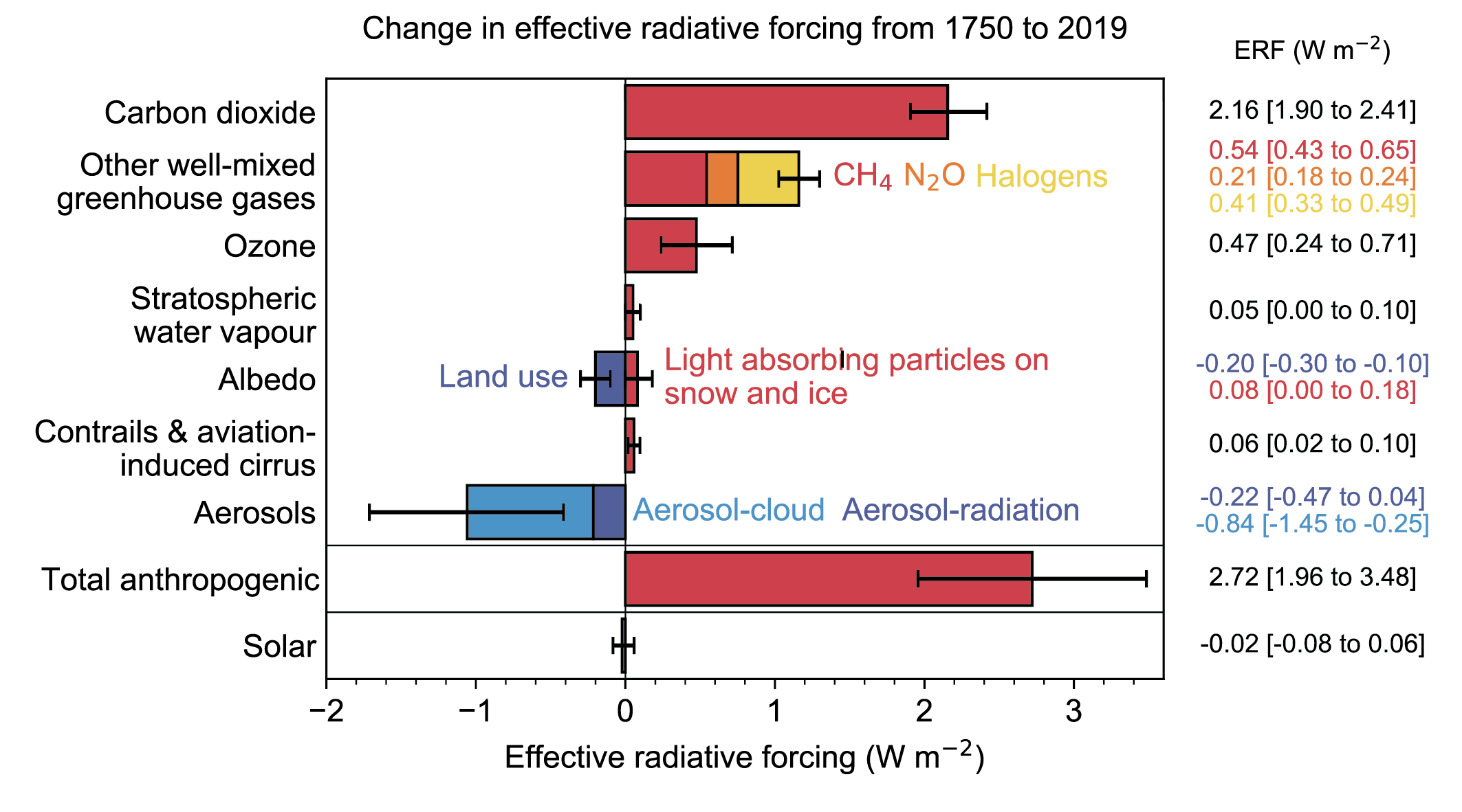By far, the strongest greenhouse gas is water vapor, not because it is very strong of itself, but it absorbs nearly all outgoing energy in the infrared spectrum except in the so called atmospheric window, where it only partially absorbs. Yet water vapor is missing from the IPCC AR6 chart seen here: