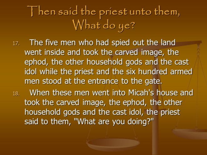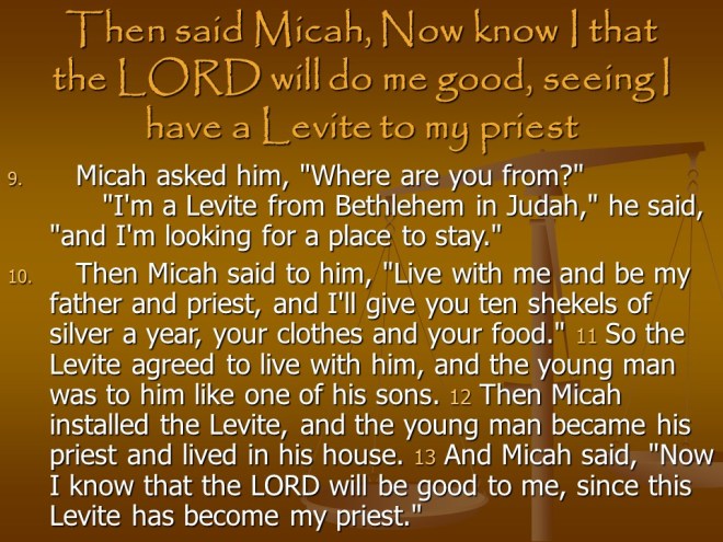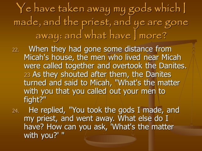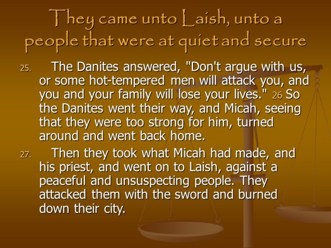 Judges 18, The Danites, Micah’s Idolatry, Danites settle in Laish. Judges 18, The Danites, Micah’s Idolatry, Danites settle in Laish.