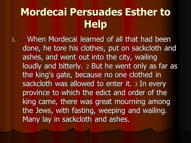 Esther 5. Esther prepared for a banquet with only her, the King and Haman in attendance. Meanwhile Haman’s rage against Mordecai was so great that he had built a seventy-five feet high gallows, on which to hang Mordecai.