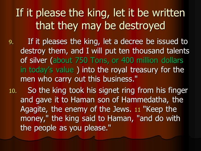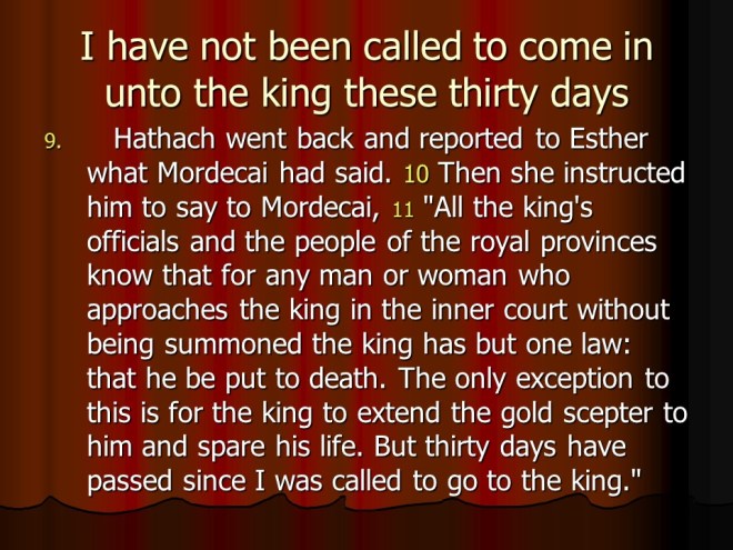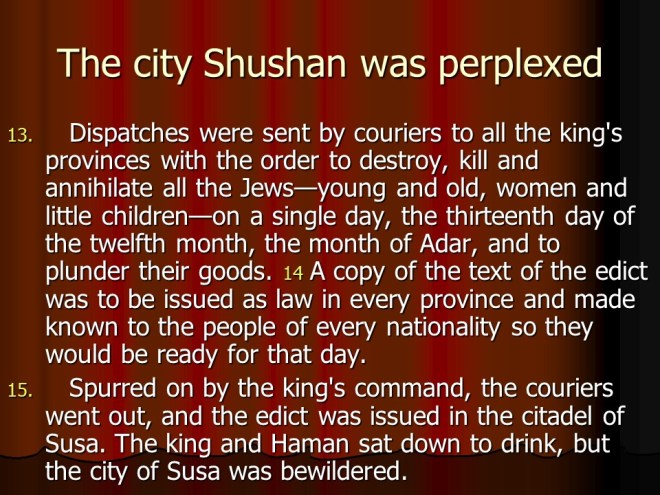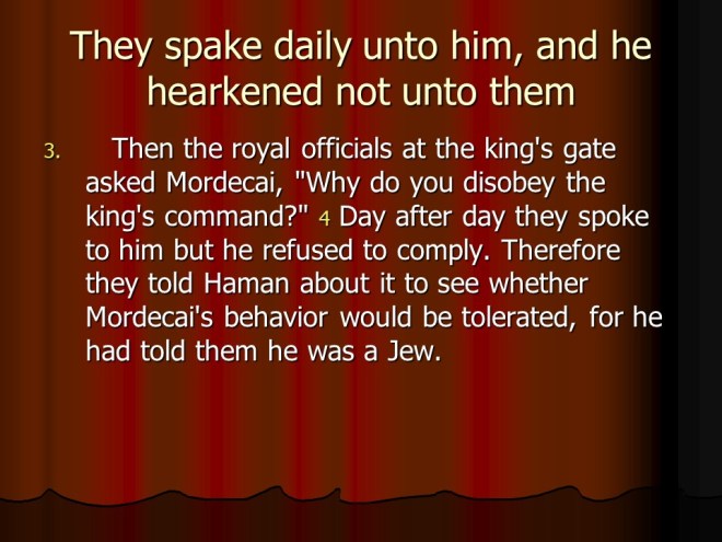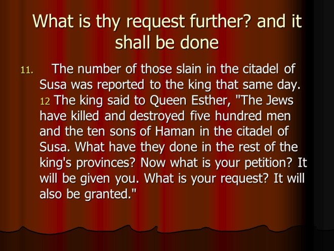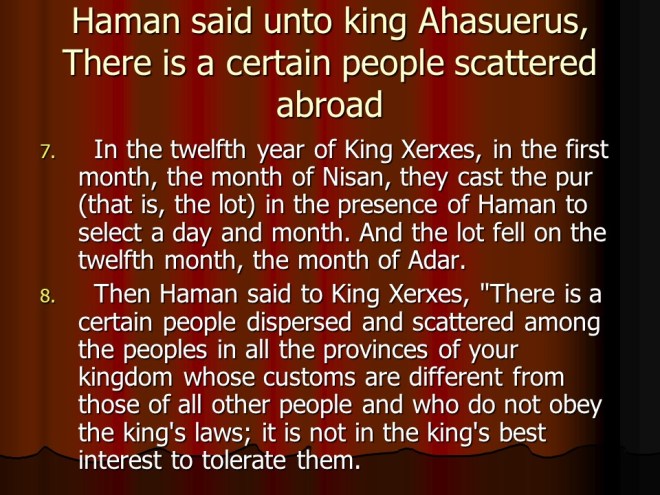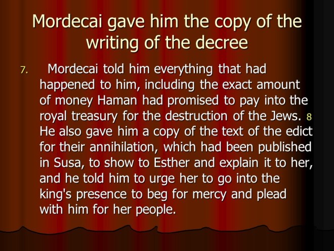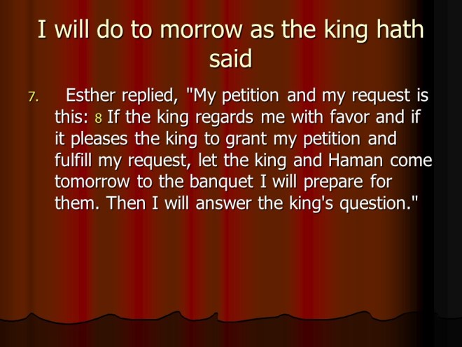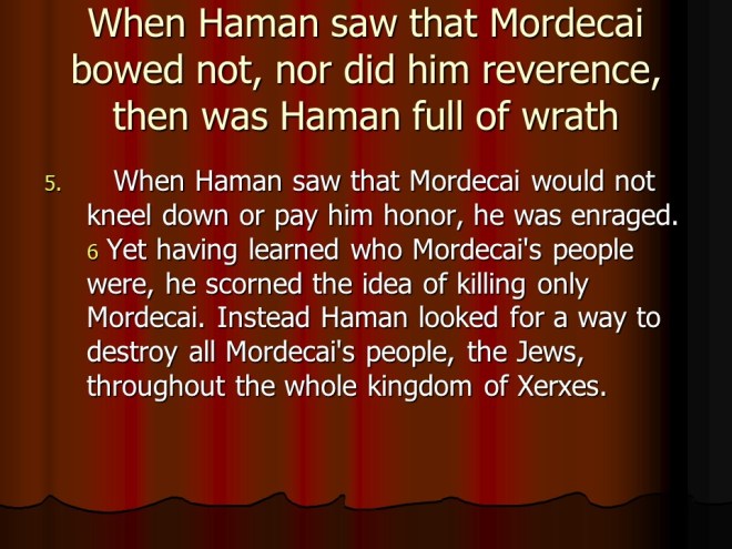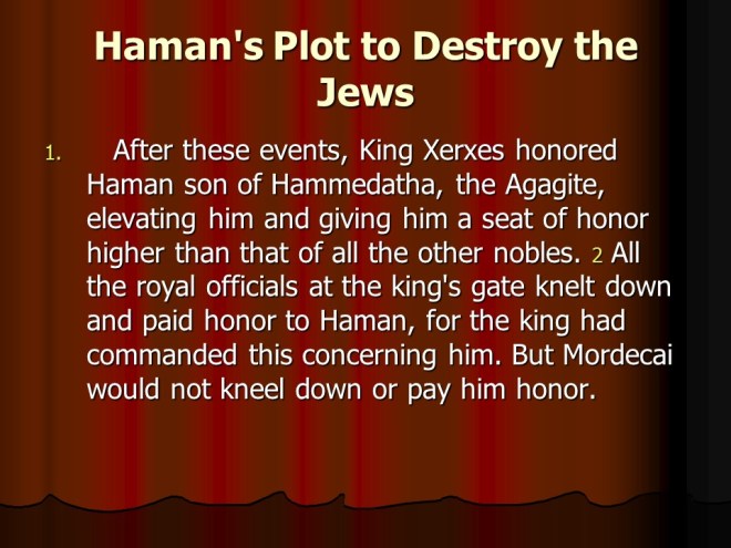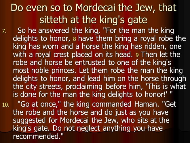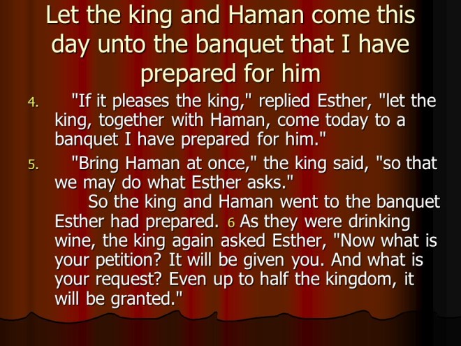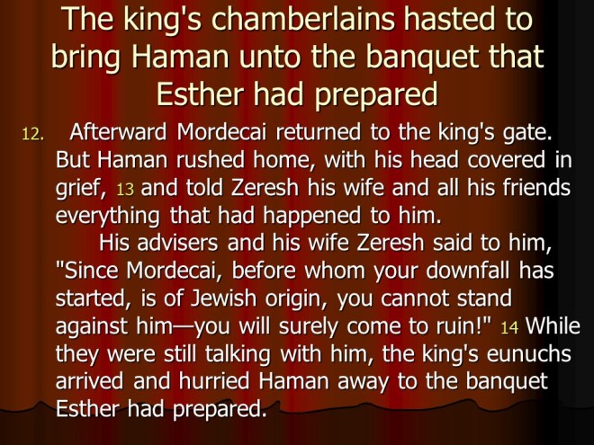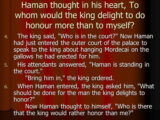 Esther 6. As it so happened, the king had a case of insomnia. To become drowsy he had the annals read to him, which told that Mordecai had averted a coup. During the banquet the king wanted to honor somebody, and rather than Haman, Mordecai was honored.