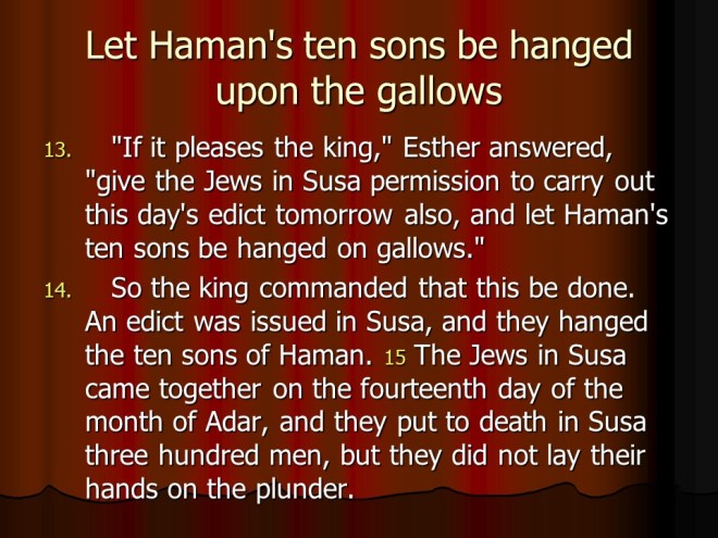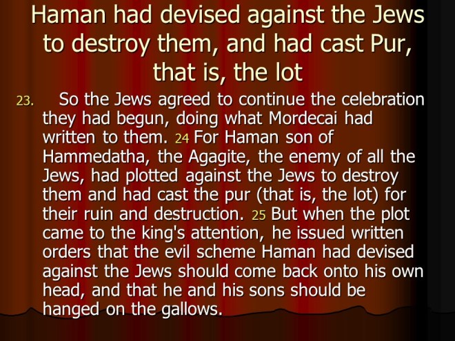 Esther7. And so it was, Haman was hanged on the gallows he had built for Mordecai.