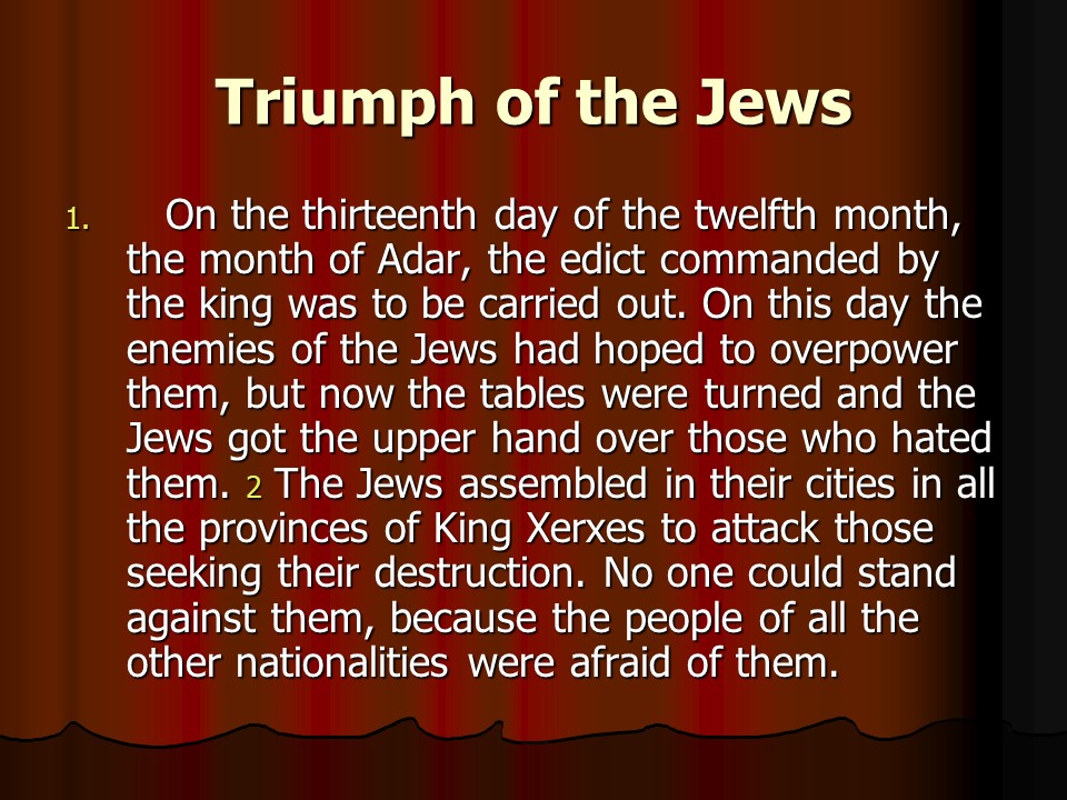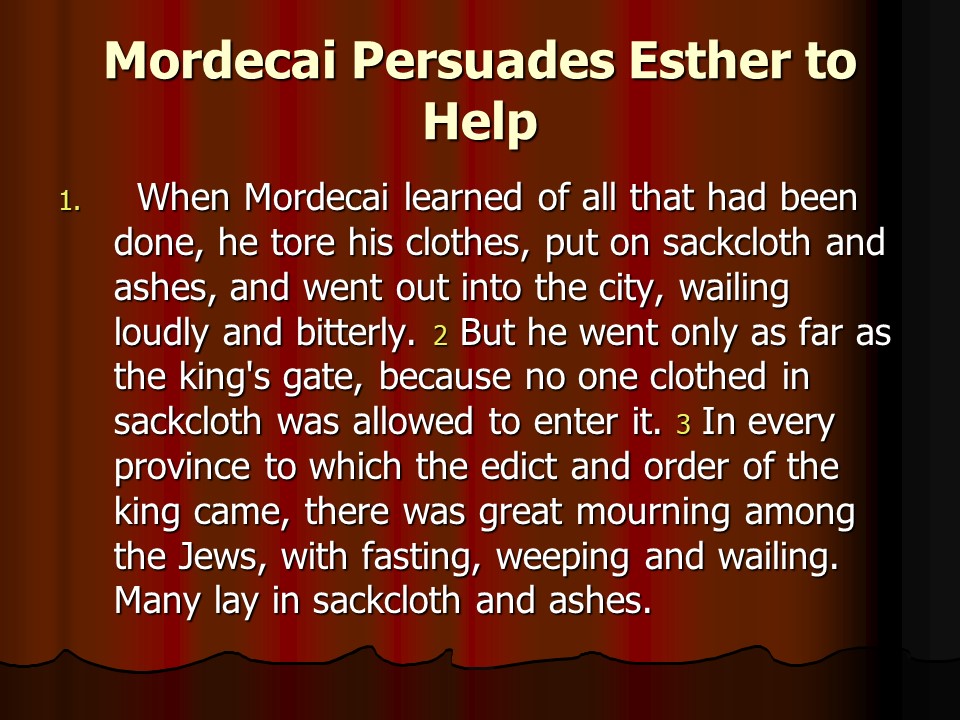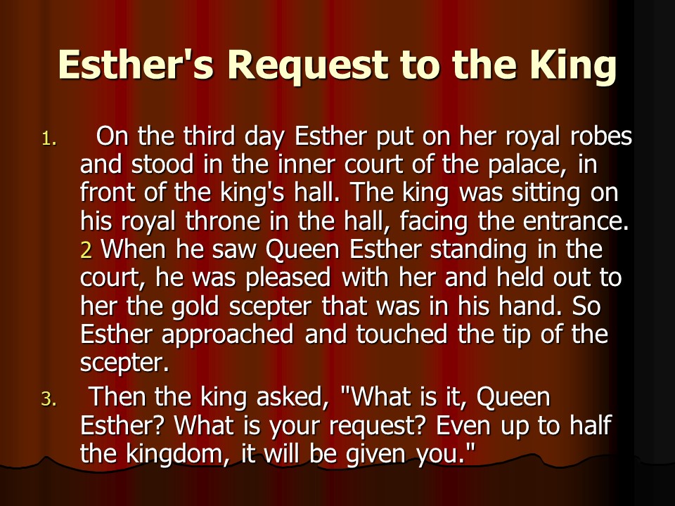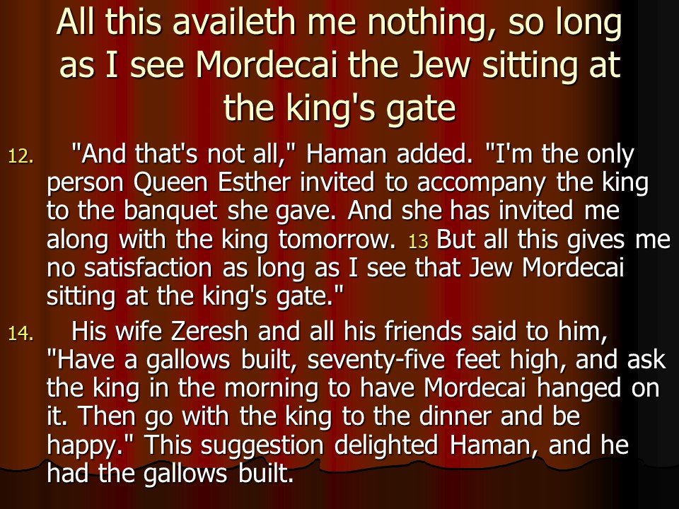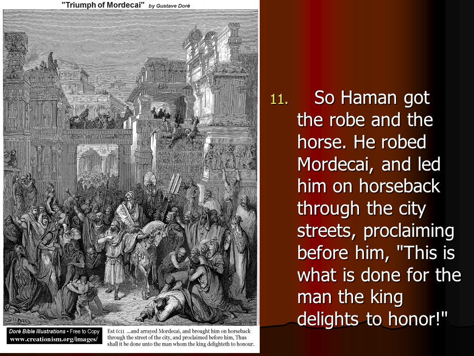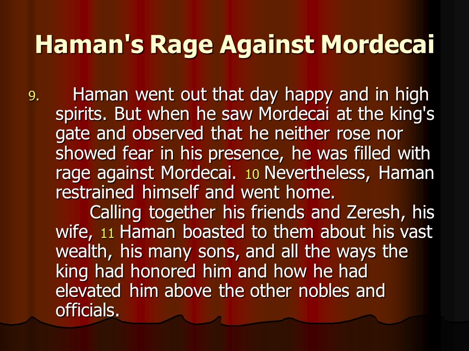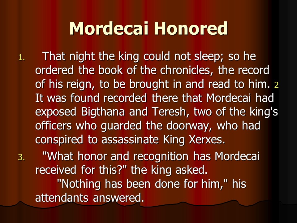 Esther 6. As it so happened, the king had a case of insomnia. To become drowsy he had the annals read to him, which told that Mordecai had averted a coup. During the banquet the king wanted to honor somebody, and rather than Haman, Mordecai was honored.