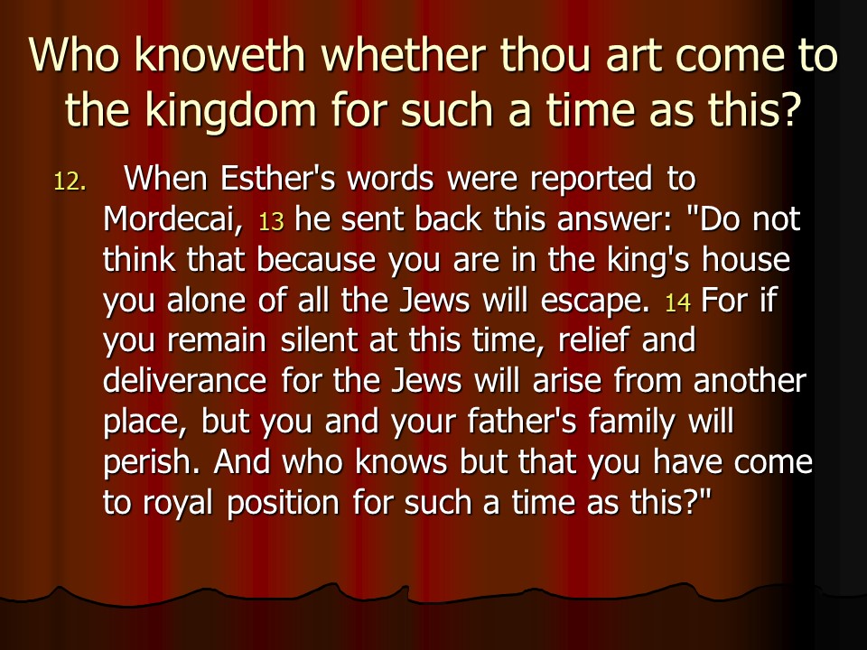 Esther 5. Esther prepared for a banquet with only her, the King and Haman in attendance. Meanwhile Haman’s rage against Mordecai was so great that he had built a seventy-five feet high gallows, on which to hang Mordecai.