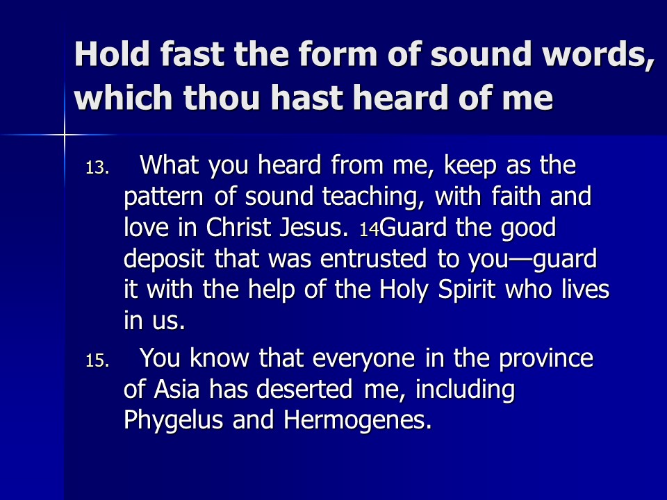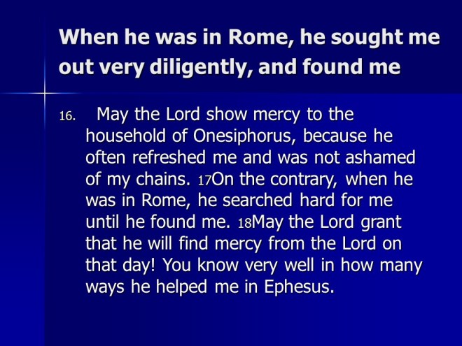 2 Timothy 1 starts out with the customary greeting. The Apostle Paul was encouraged by Timothy’s faith, which he got from his mother Eunice and grandmother Lois. Paul was not ashamed of the Gospel “for I know whom I have believed, and am persuaded that he is able to keep that which I have committed unto him against that day.” Then Paul urged Timothy to be loyal to the faith.