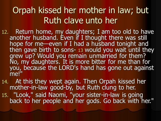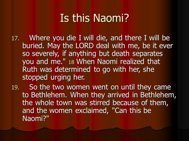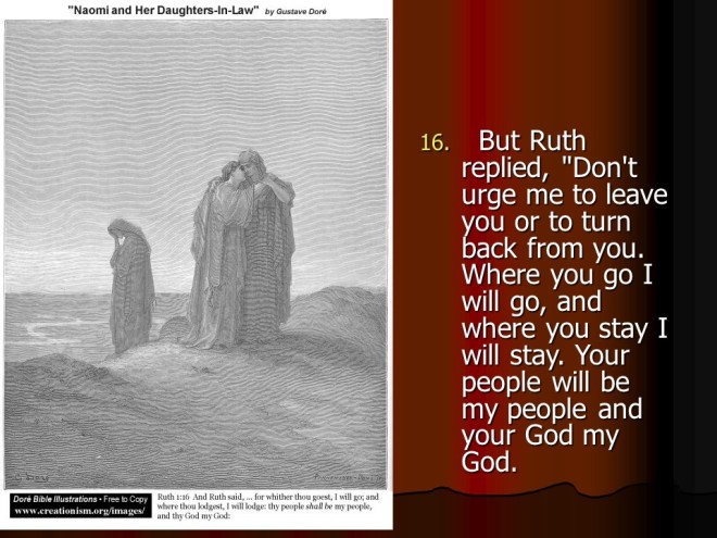 Ruth 1. Elimelech’s family went to Moab, and all the men in the family died. Naomi returned back to Israel with Ruth, a Moabite. The famous quote from Ruth 1: “Intreat me not to leave thee, or to return from following after thee: for whither thou goest, I will go; and where thou lodgest, I will lodge: thy people shall be my people, and thy God my God:”.