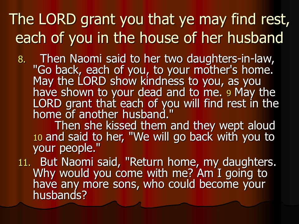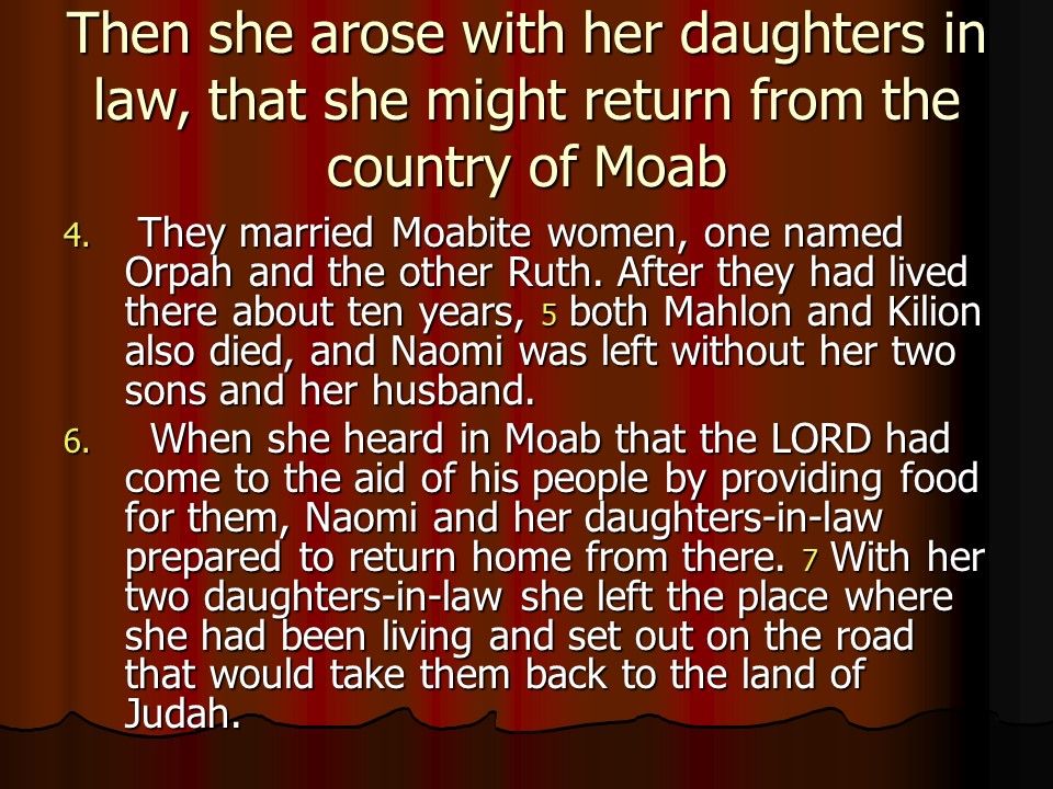 Ruth 1. Elimelech’s family went to Moab, and all the men in the family died. Naomi returned back to Israel with Ruth, a Moabite. The famous quote from Ruth 1: “Intreat me not to leave thee, or to return from following after thee: for whither thou goest, I will go; and where thou lodgest, I will lodge: thy people shall be my people, and thy God my God:”.